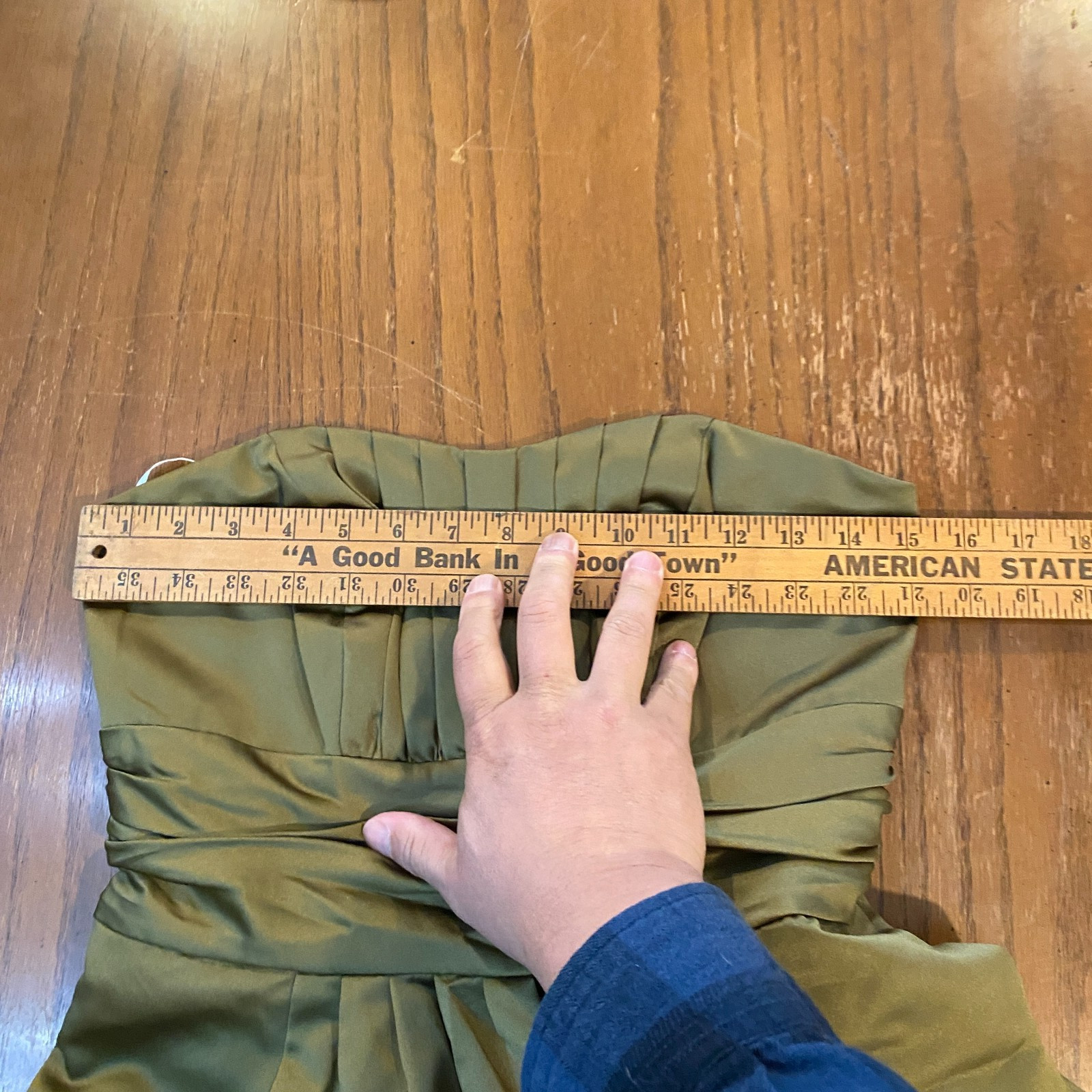 как выглядит David s Bridal Strapless Olive Green Formal Evening Gown Bridesmaid Dress Sz 4 фото