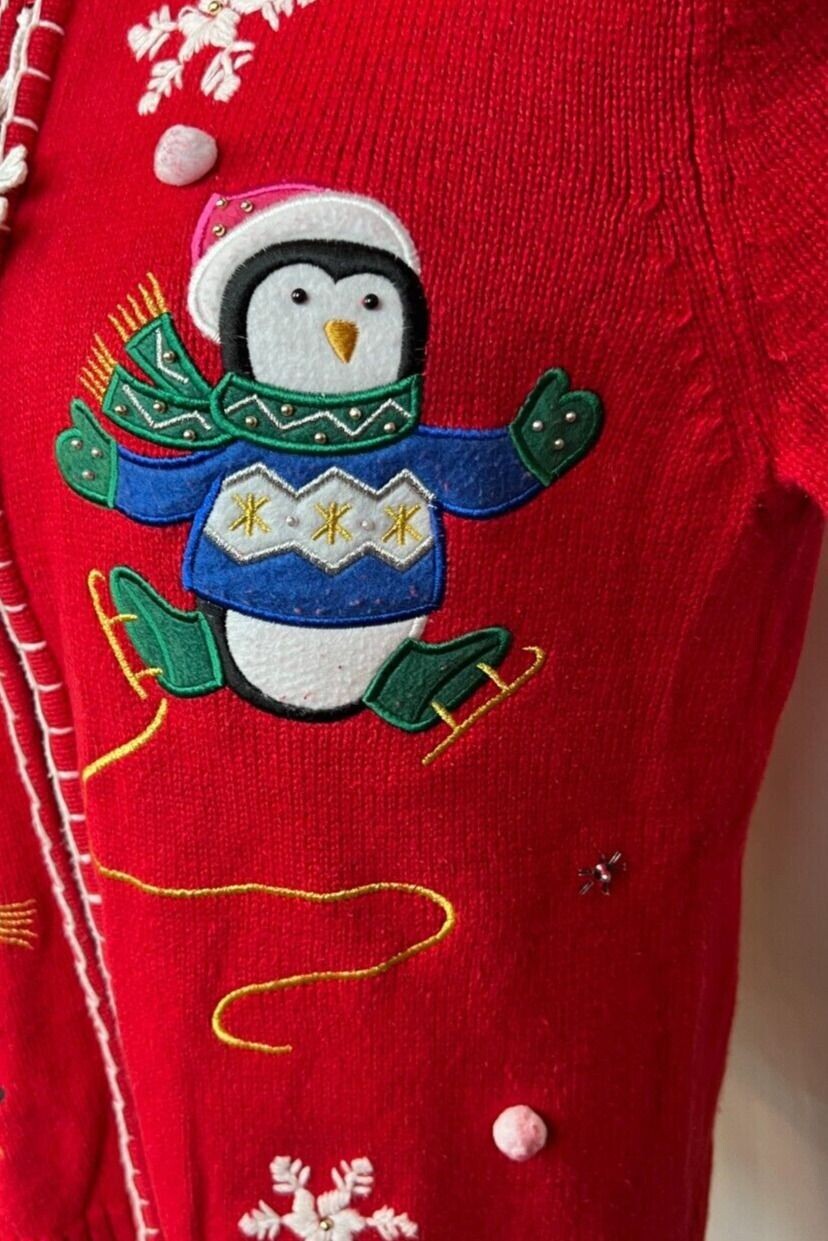 как выглядит Vintage Christmas Red Cardigan With Embroidered Penguins Snowmen Theme фото