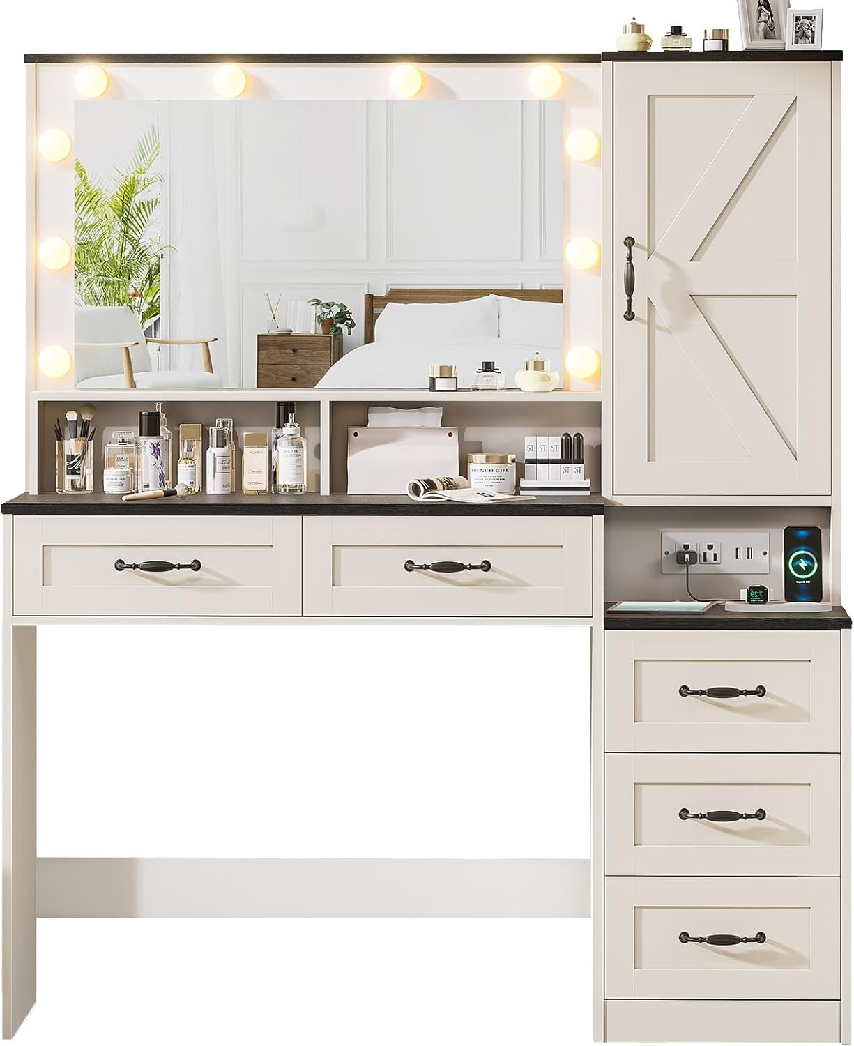 Farmhouse Vanity Desk with Mirror and 10 Led Lights, 45.3 Large Makeup Vanity T