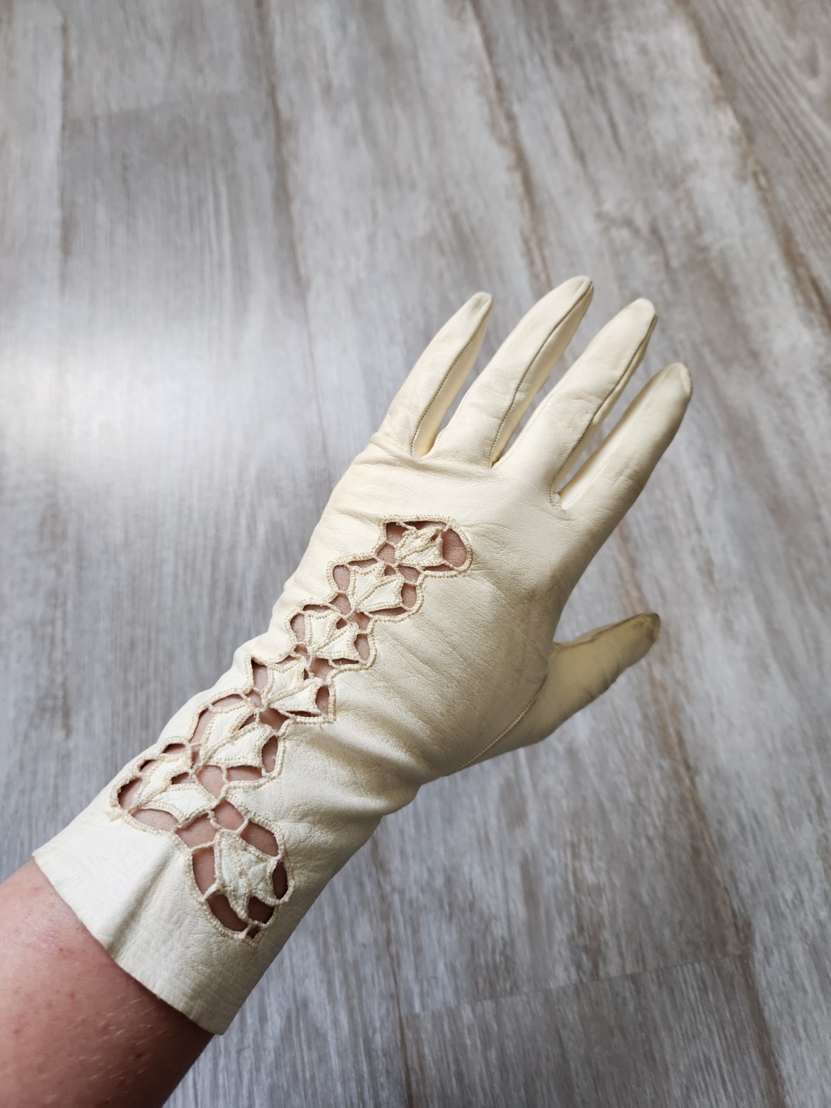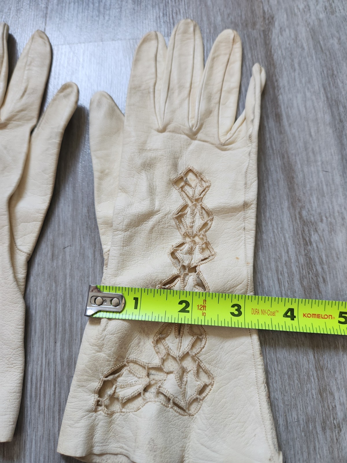 Vintage White Leather Gloves Cutout Lacey Crochet Details 40s 50s sz Small