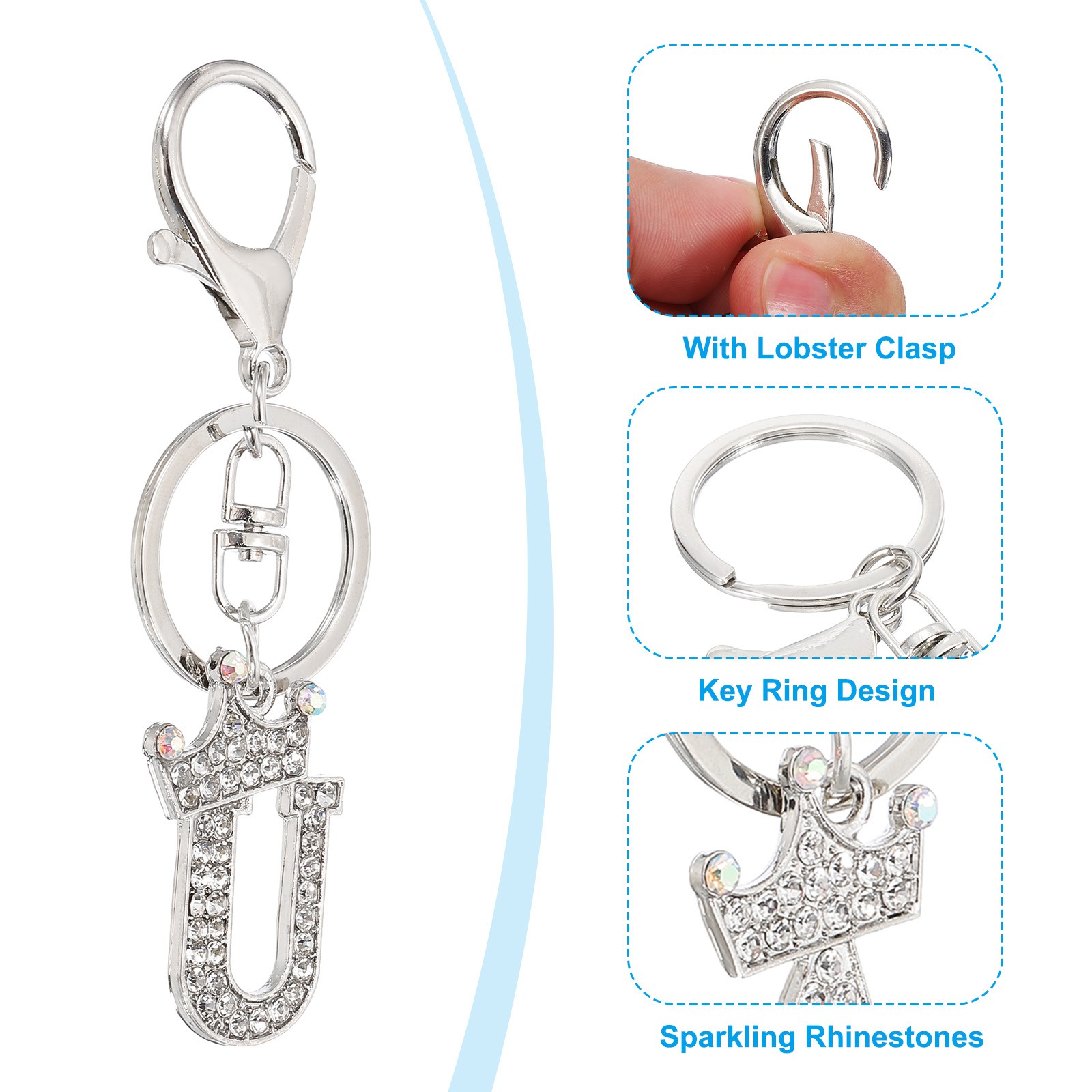 как выглядит Initial Letter Keychain, 2 Pcs Letter U Crown Design Charm, Silver Tone фото