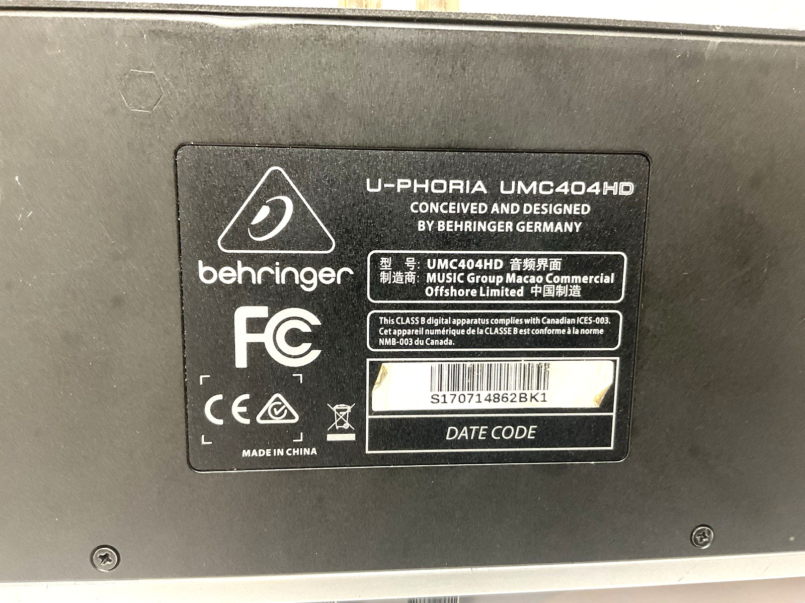Behringer U-Phoria UMC404HD Audio Interface No Power Supply For Parts Or Repair