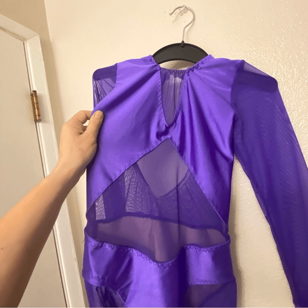 как выглядит Custom solo dance costume purple unitard jumpsuit mesh XXS adult LC child фото