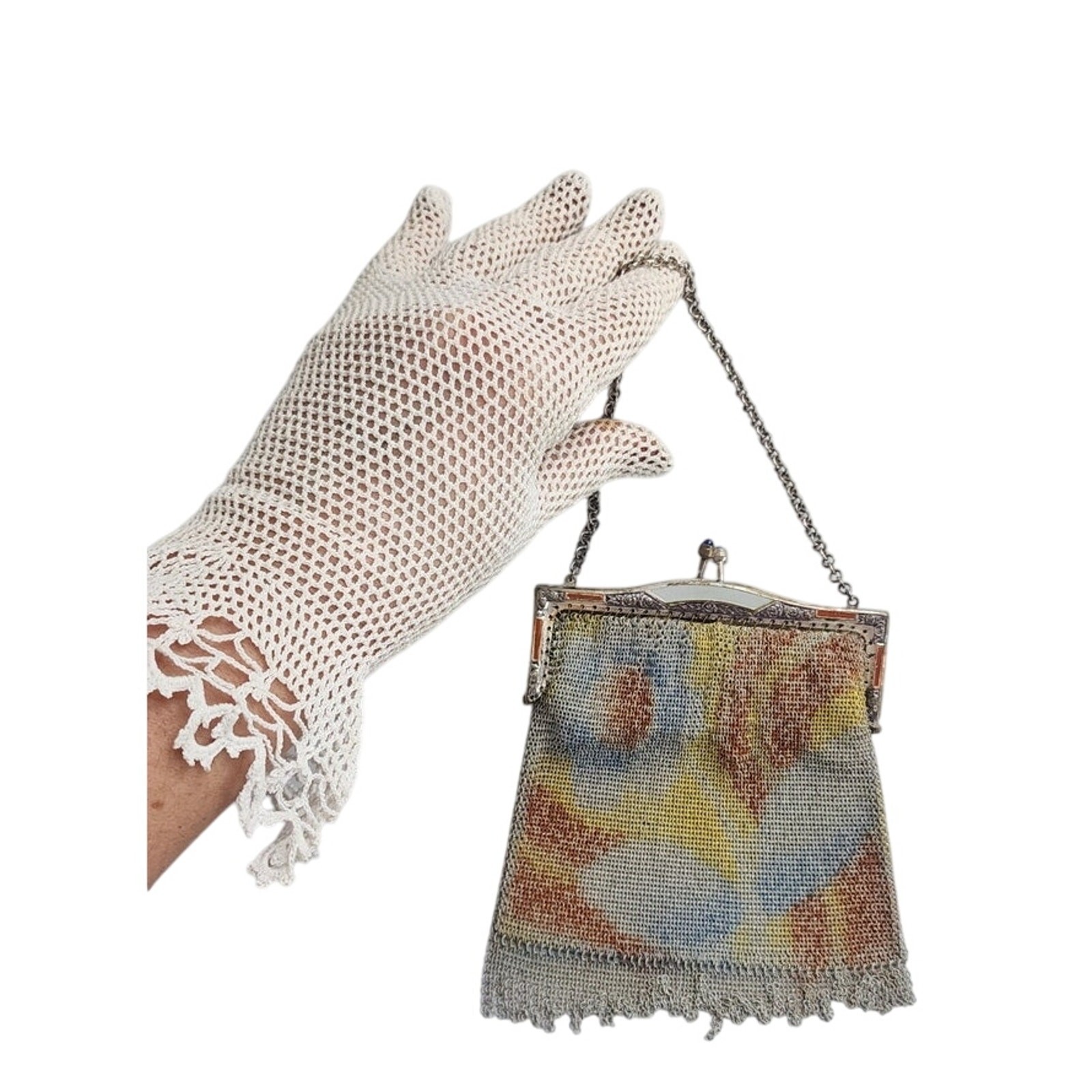 Vintage 1920s Mesh Bag Watercolor Pattern Art Deco Enamel Frame Purse