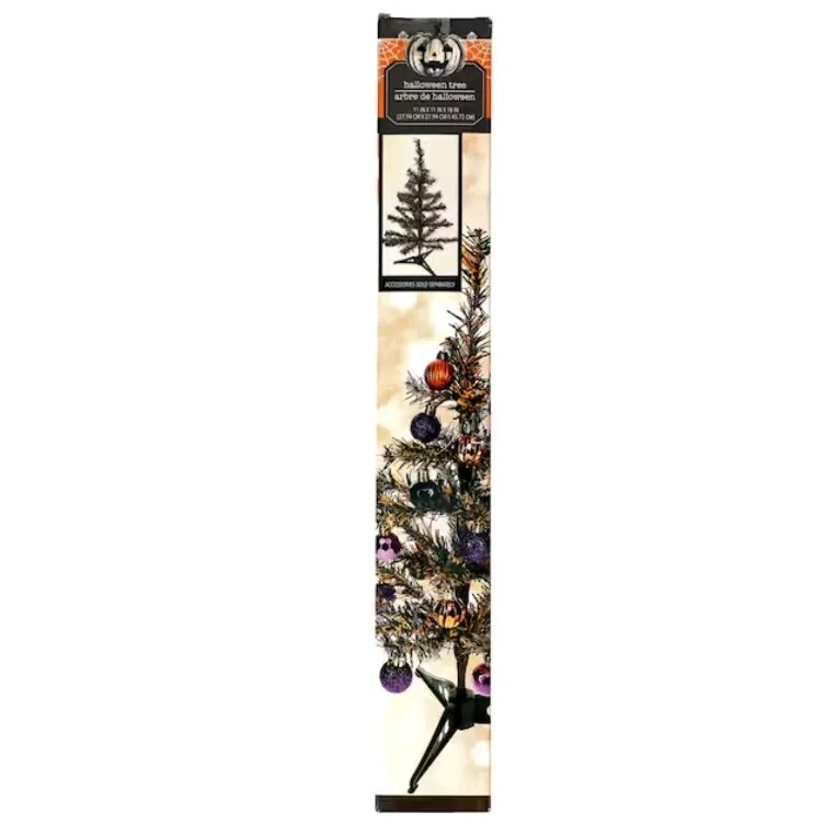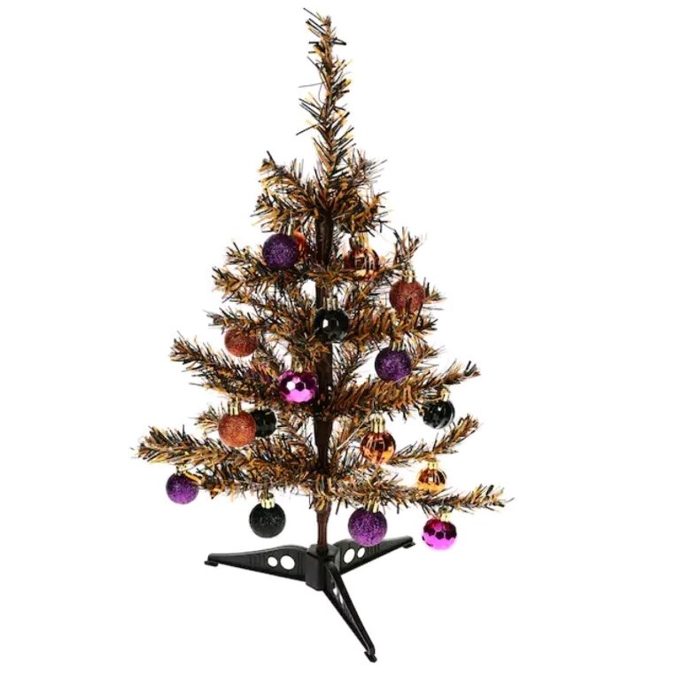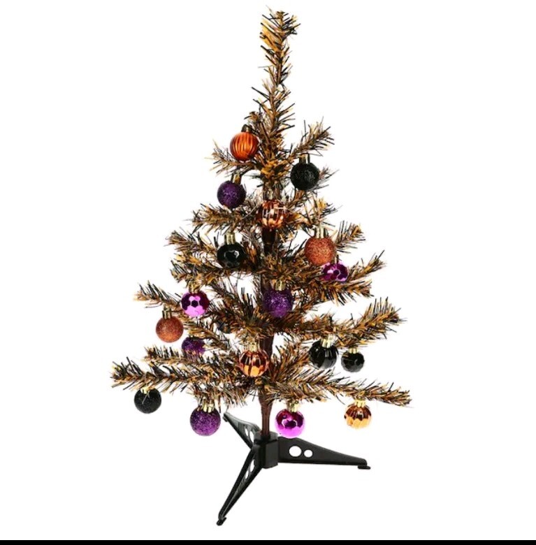 как выглядит Halloween Artificial Tree with Base 18 in Tall 35 Tip Orange Black Tinsel New фото