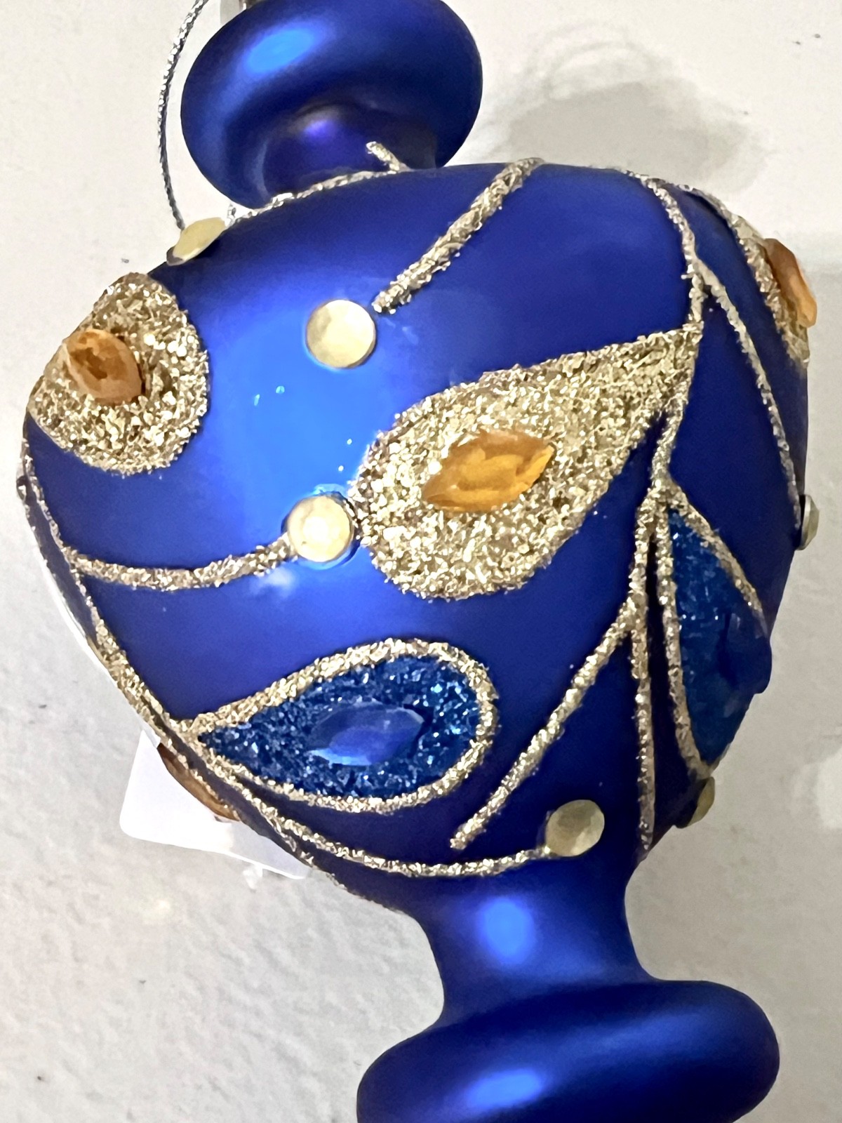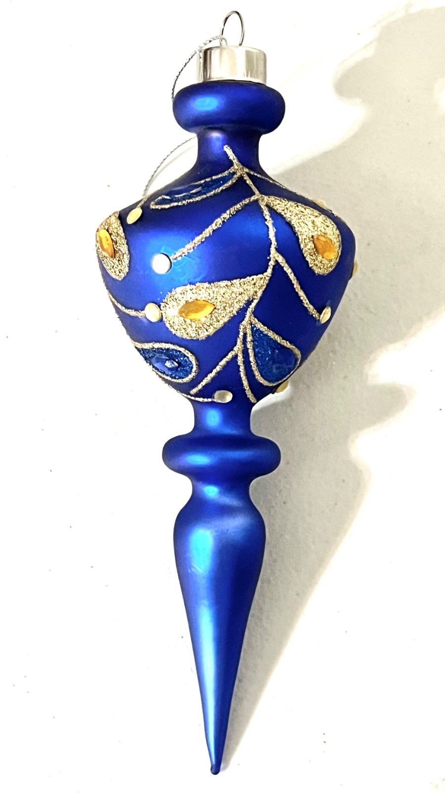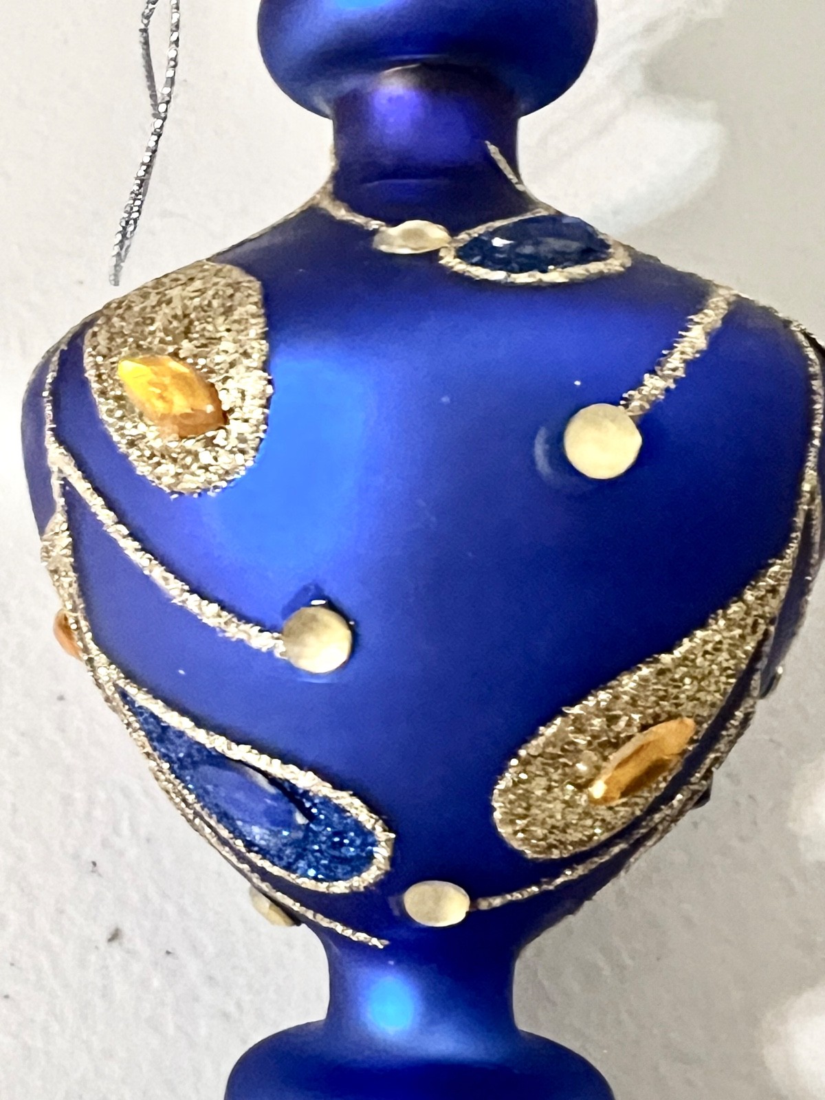 • Blue Finial Glass Christmas Ornament Gold Blue Glitter w/Rhinestones 1/2