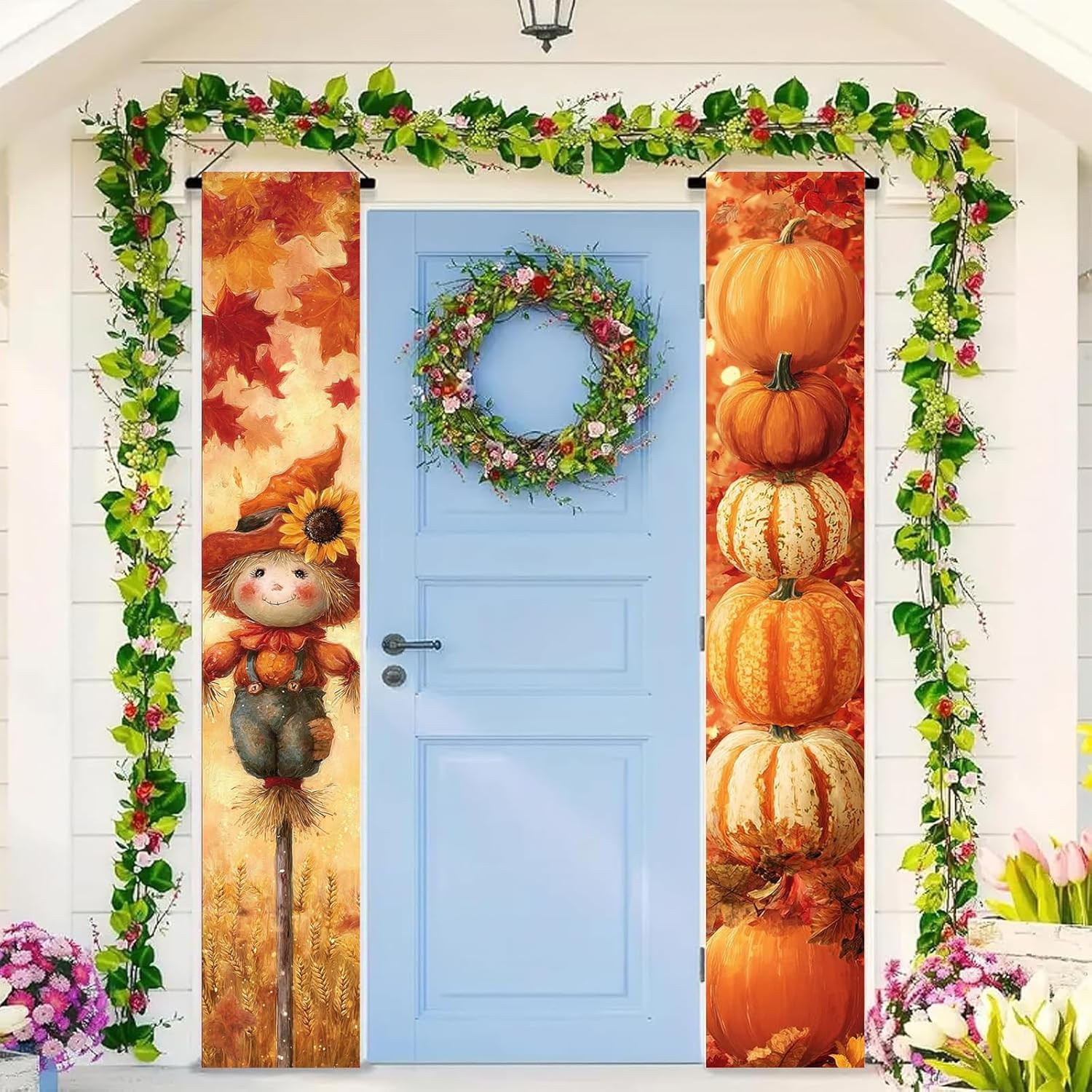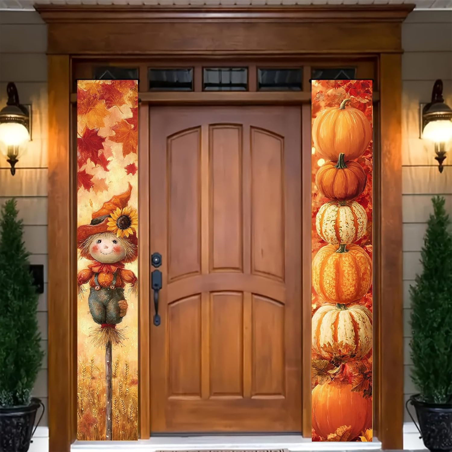Thankgiving Pumpkin Stack Porch Banner Vertical Door Pair 12X71 Inch Scarecrow F