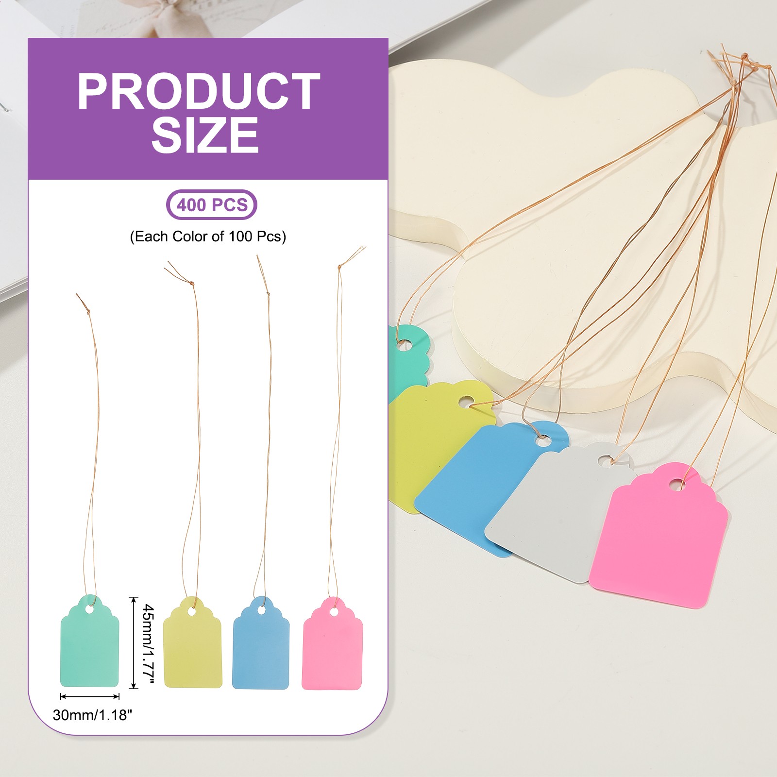 400Pack Price Tags with String, 30x45mm Plastic Tags, Green Pink Yellow Blue
