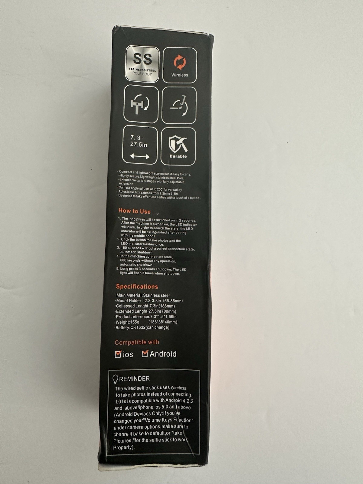 Wireless Selfie Stick L01s Enhanced Stainless Steel 7.3 - 27.5in iOS Android NEW