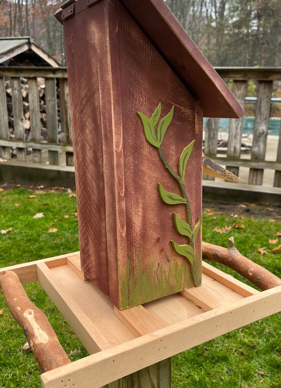 Two Story Bird Feeder w/ Real Branch and Floral Accents, Handcrafted