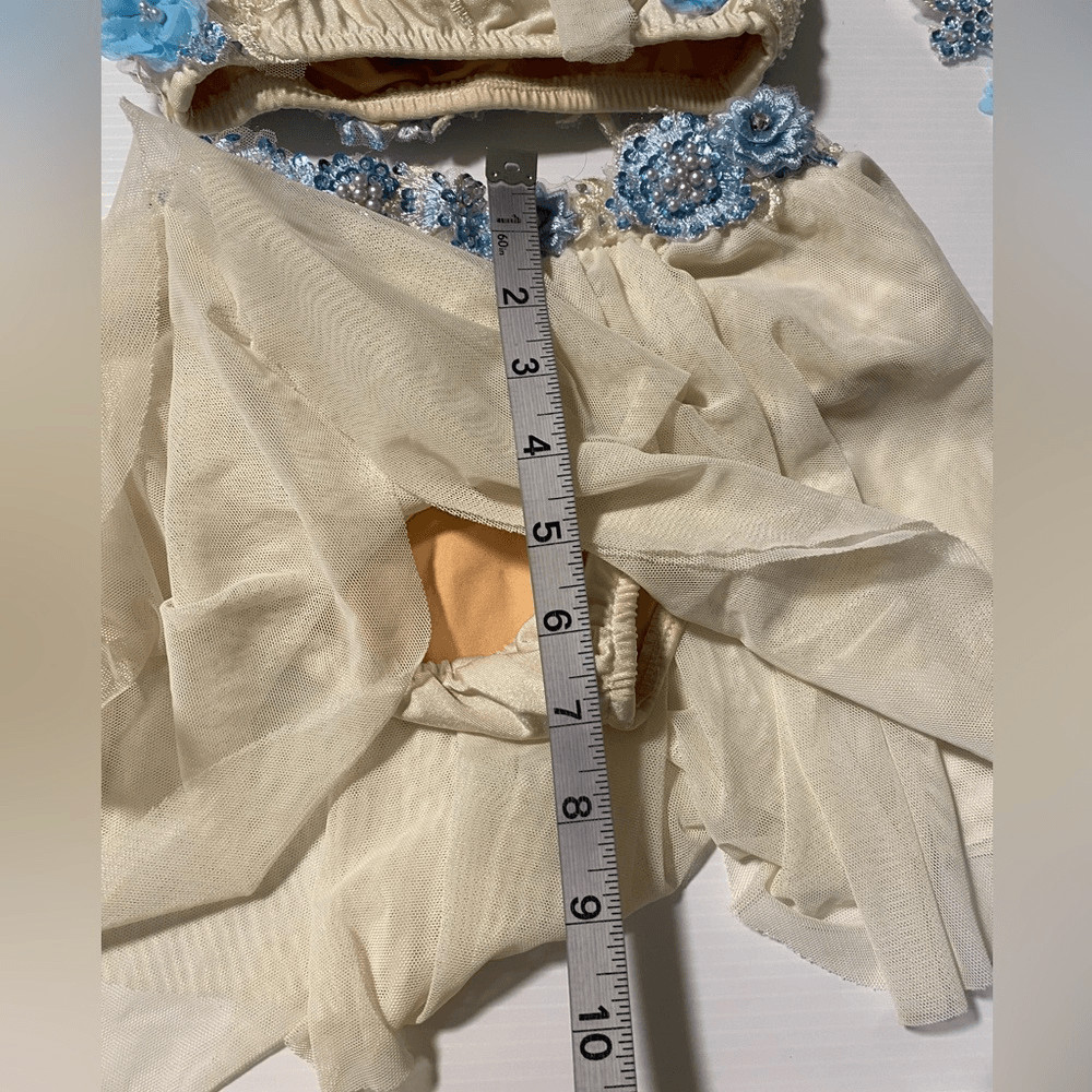 как выглядит Glamour solo dance costume 2 piece white/cream blue embellished MC medium child фото
