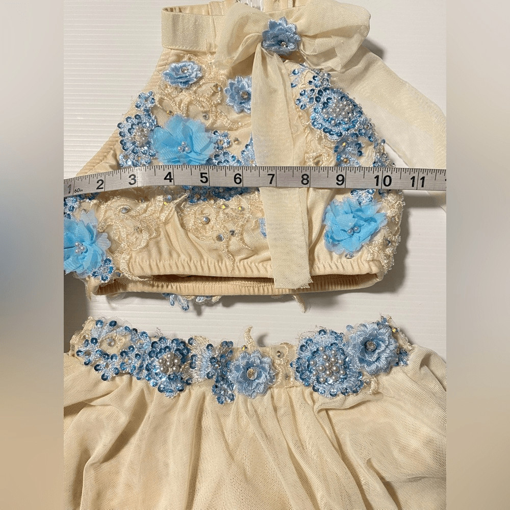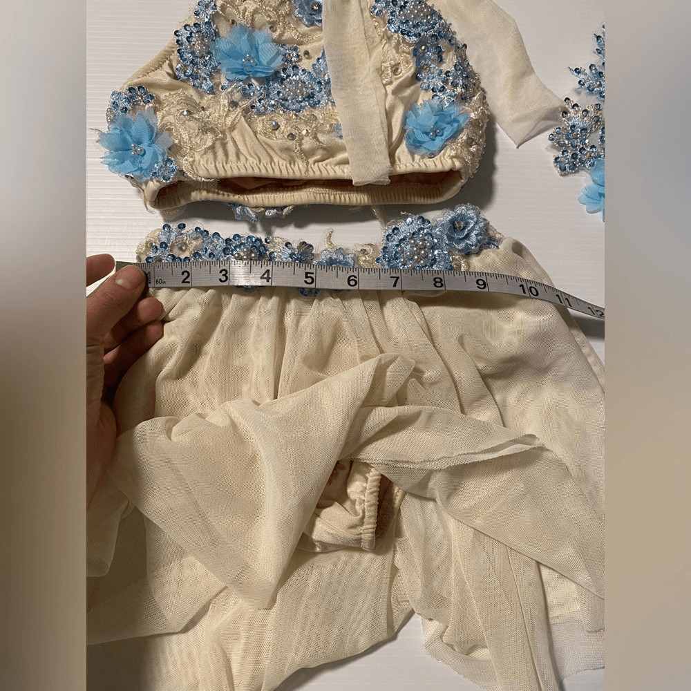 Glamour solo dance costume 2 piece white/cream blue embellished MC medium child