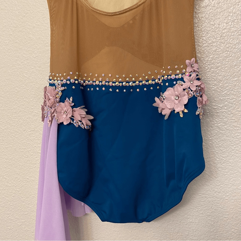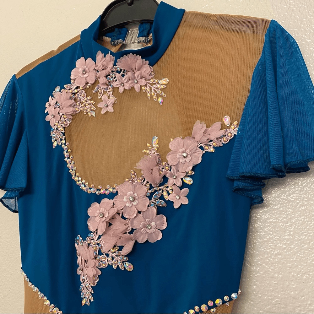 Custom made solo dance costume teal blue modest rhinestoned mesh lyrical SA