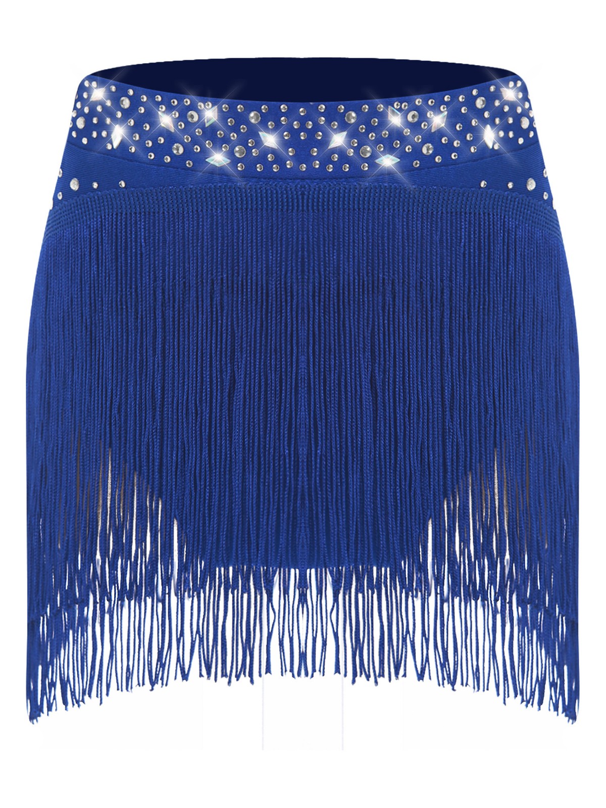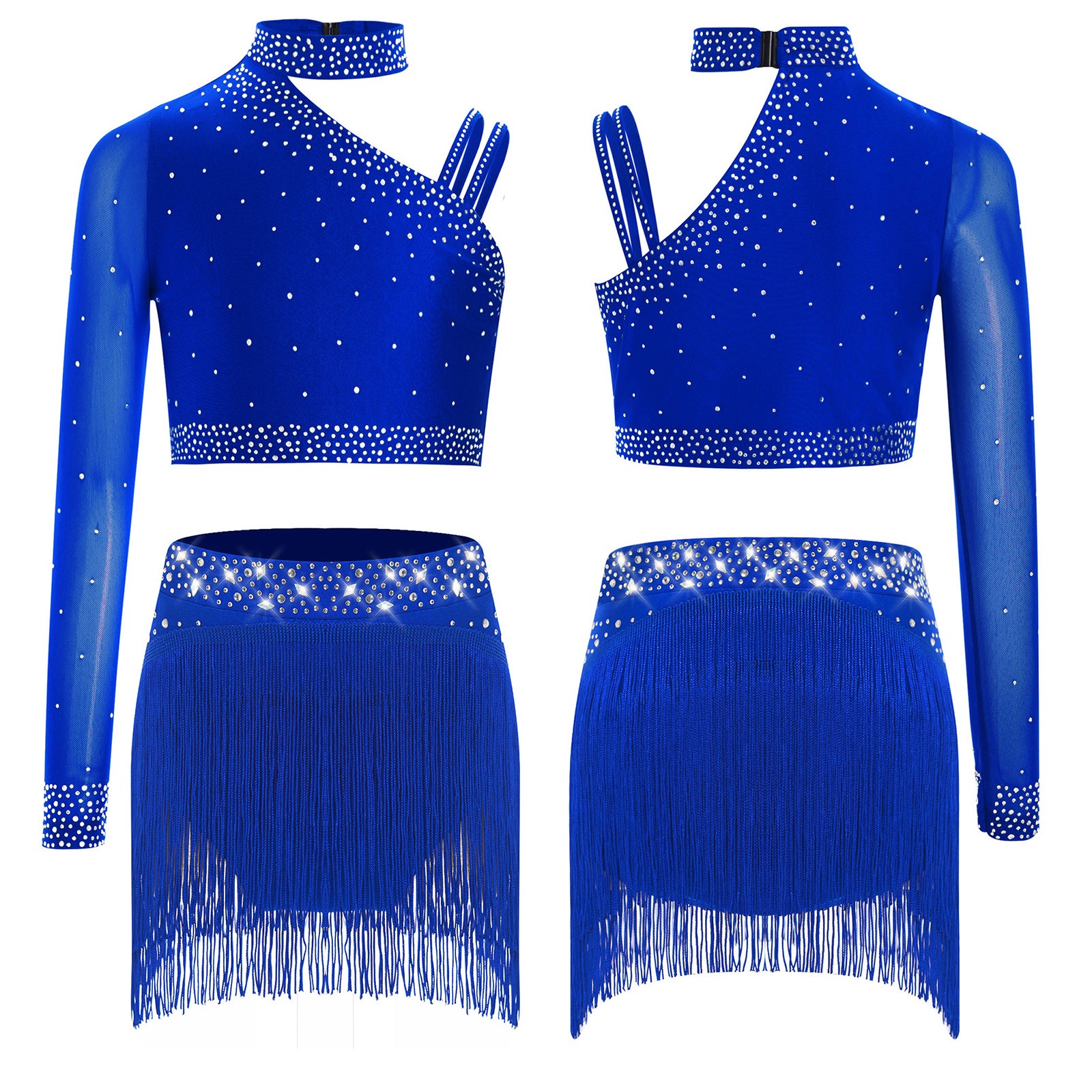 Kids Girl Dance Outfit One Shoulder Rhinestones Crop Top with Fringe Skirt Dress