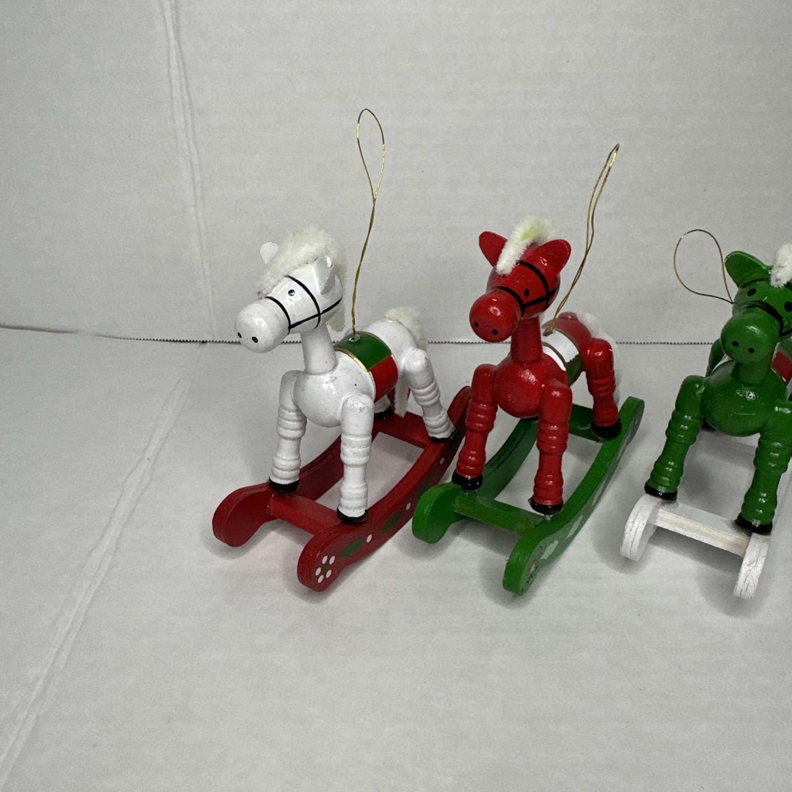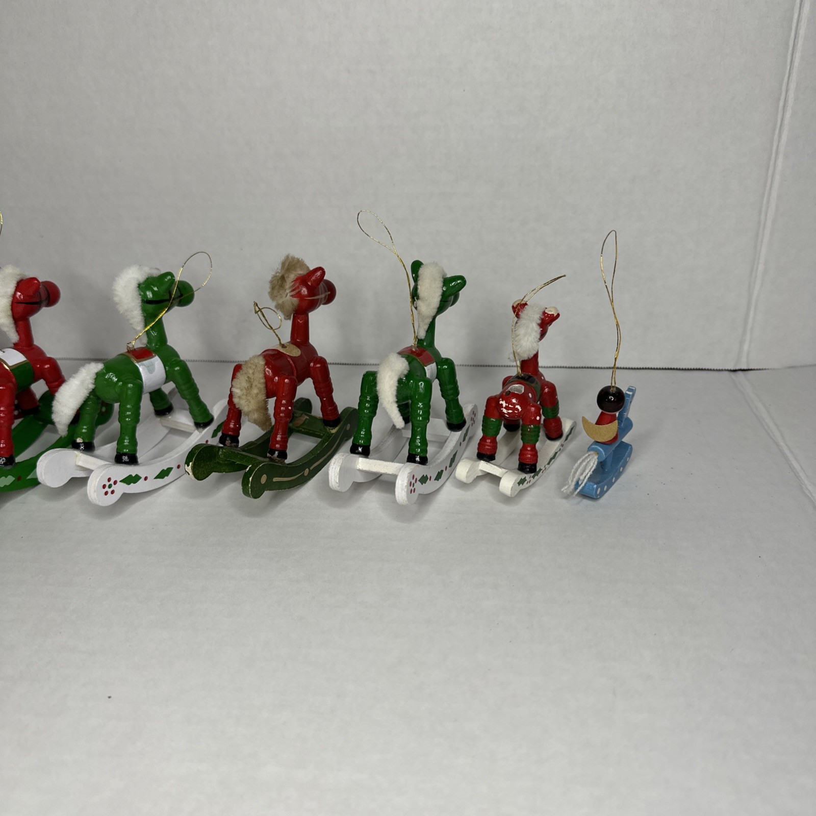 как выглядит 7 Vintage Christmas Wood Rocking Horse Ornaments Hand Painted holiday Red White фото