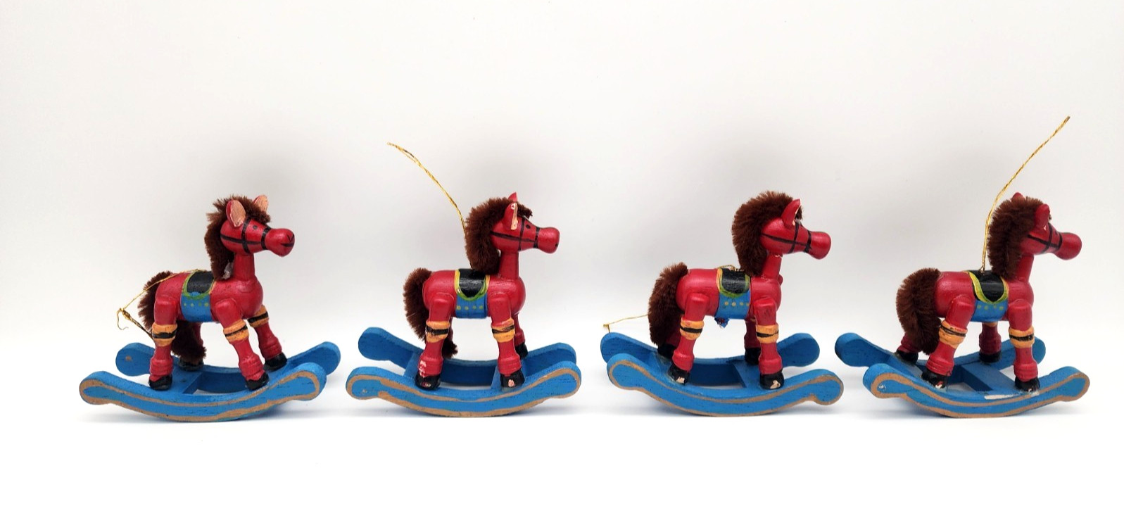 как выглядит VINTAGE FOUR CHRISTMAS RED WOODEN ROCKING HORSE HOLIDAY ORNAMENTS MARKED TAIWAN фото