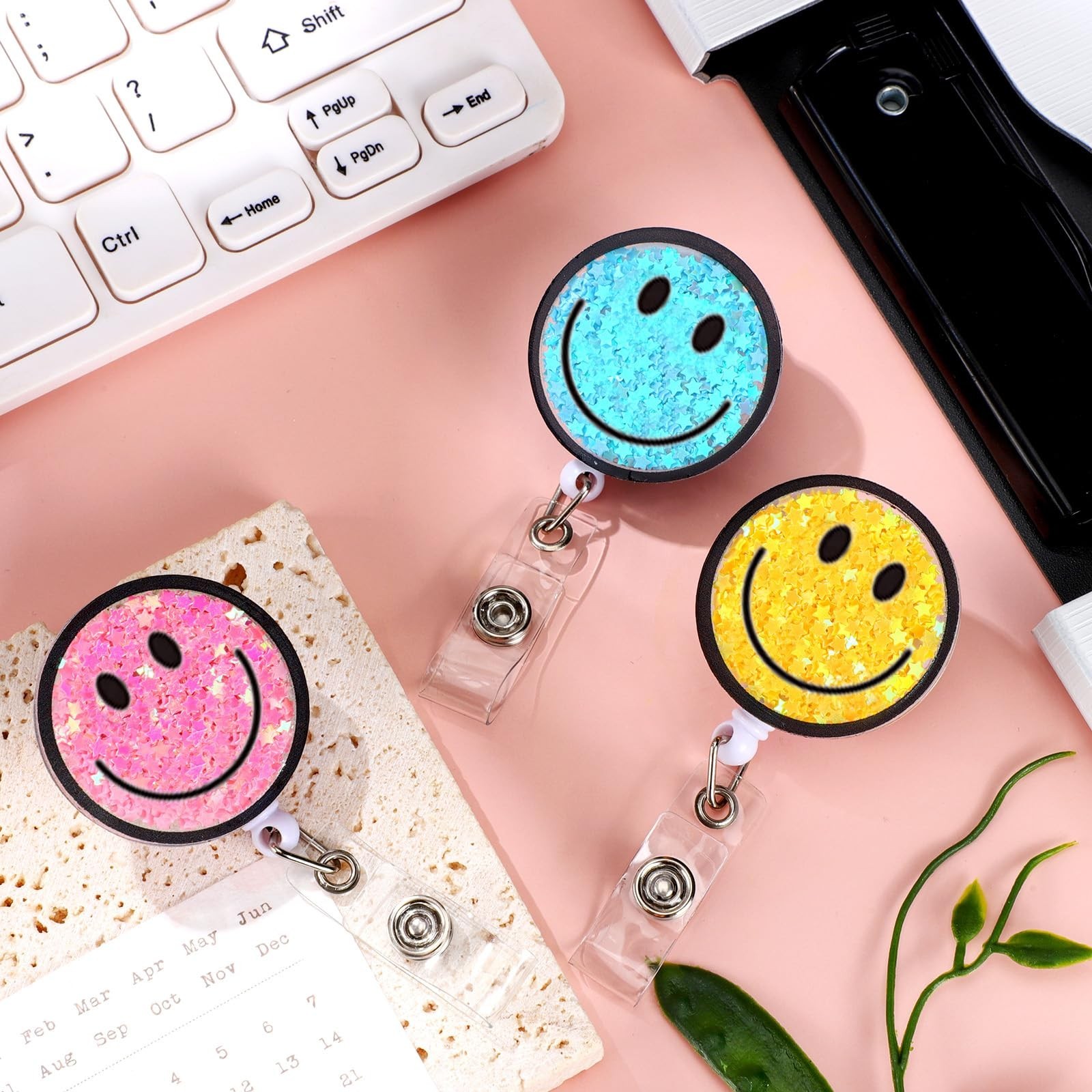 3 Pcs Badge Reel Retractable Smile Face Glitter Badge Holder Name Tag Holders...