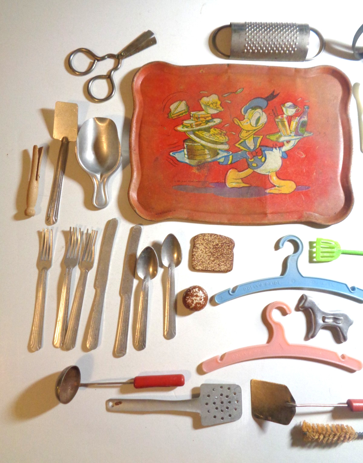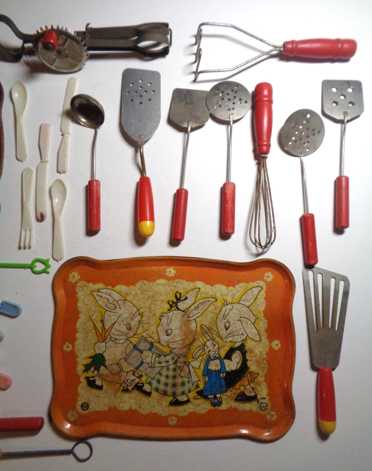 38 Pc VTG CHILD'S TOY-KITCHEN RED HANDLED/ALUMINUM UTENSILS-METAL TRAYS, MORE