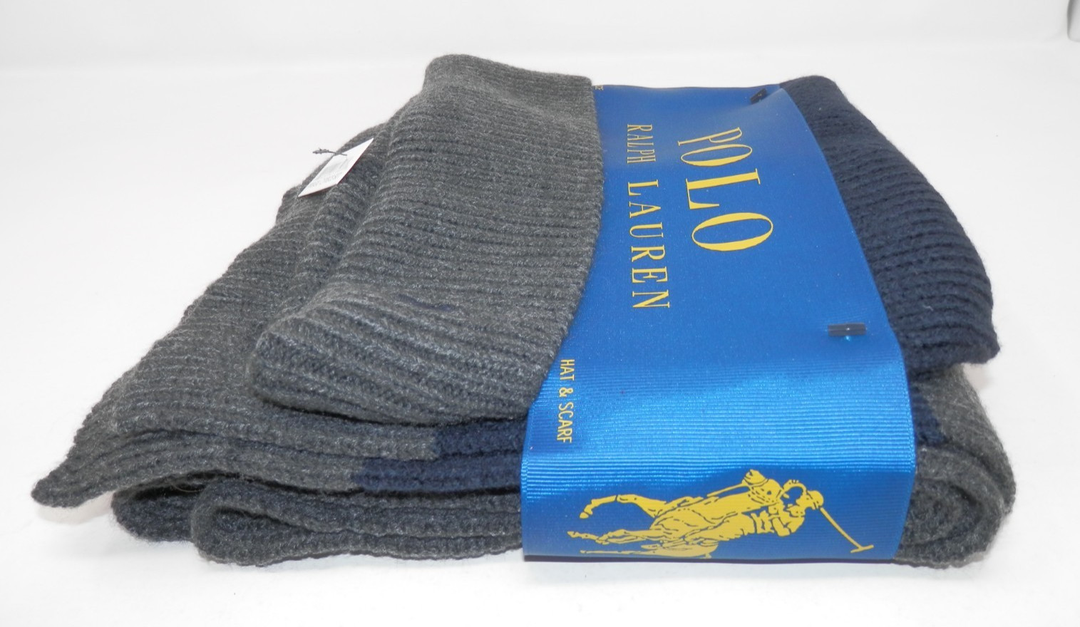 Polo Ralph Lauren Adult Beanie Hat Scarf Set Gray Navy Blue 2 Pc Knit Logo