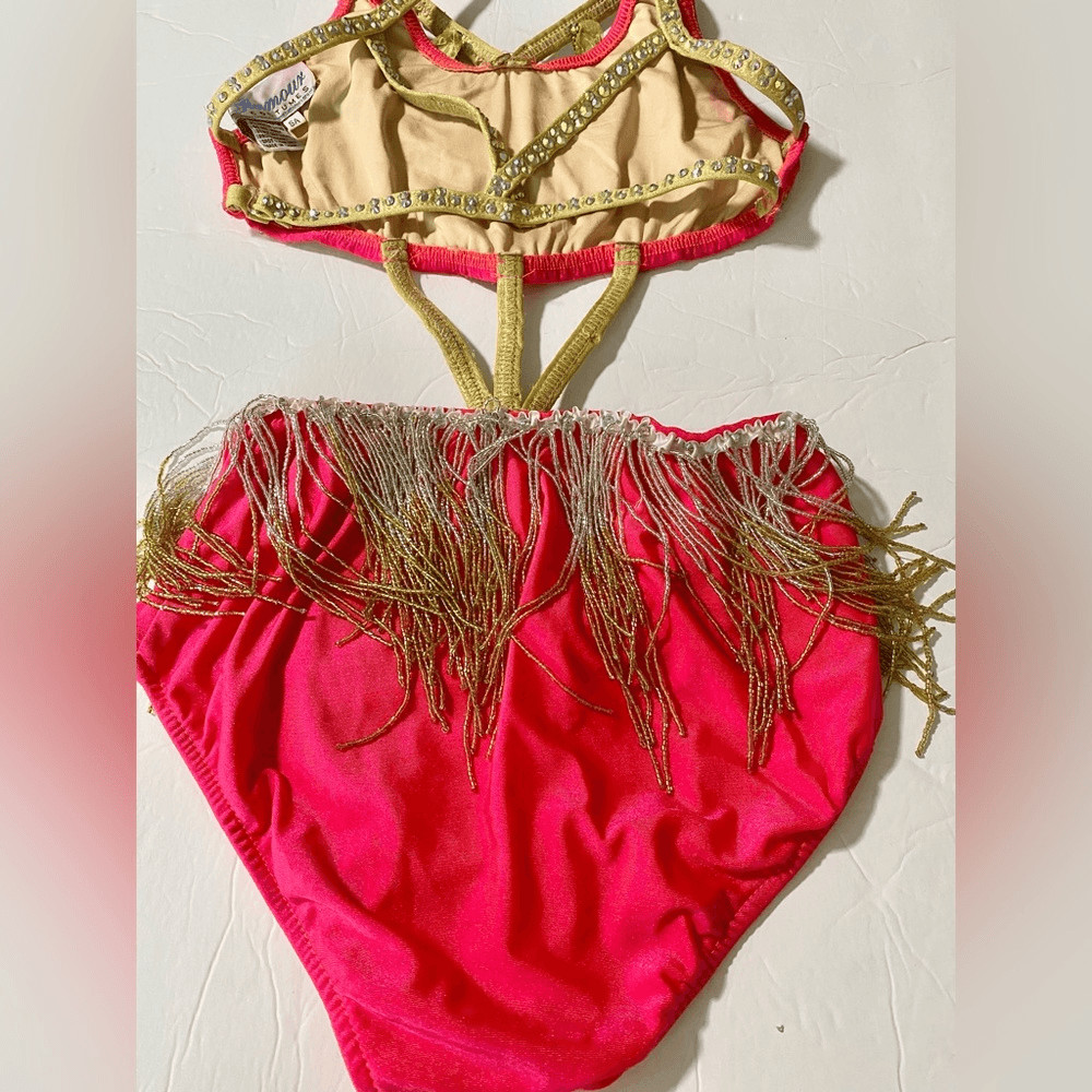 как выглядит Glamour solo dance costume hot pink fringe embellishment rhinestone leotard SA фото