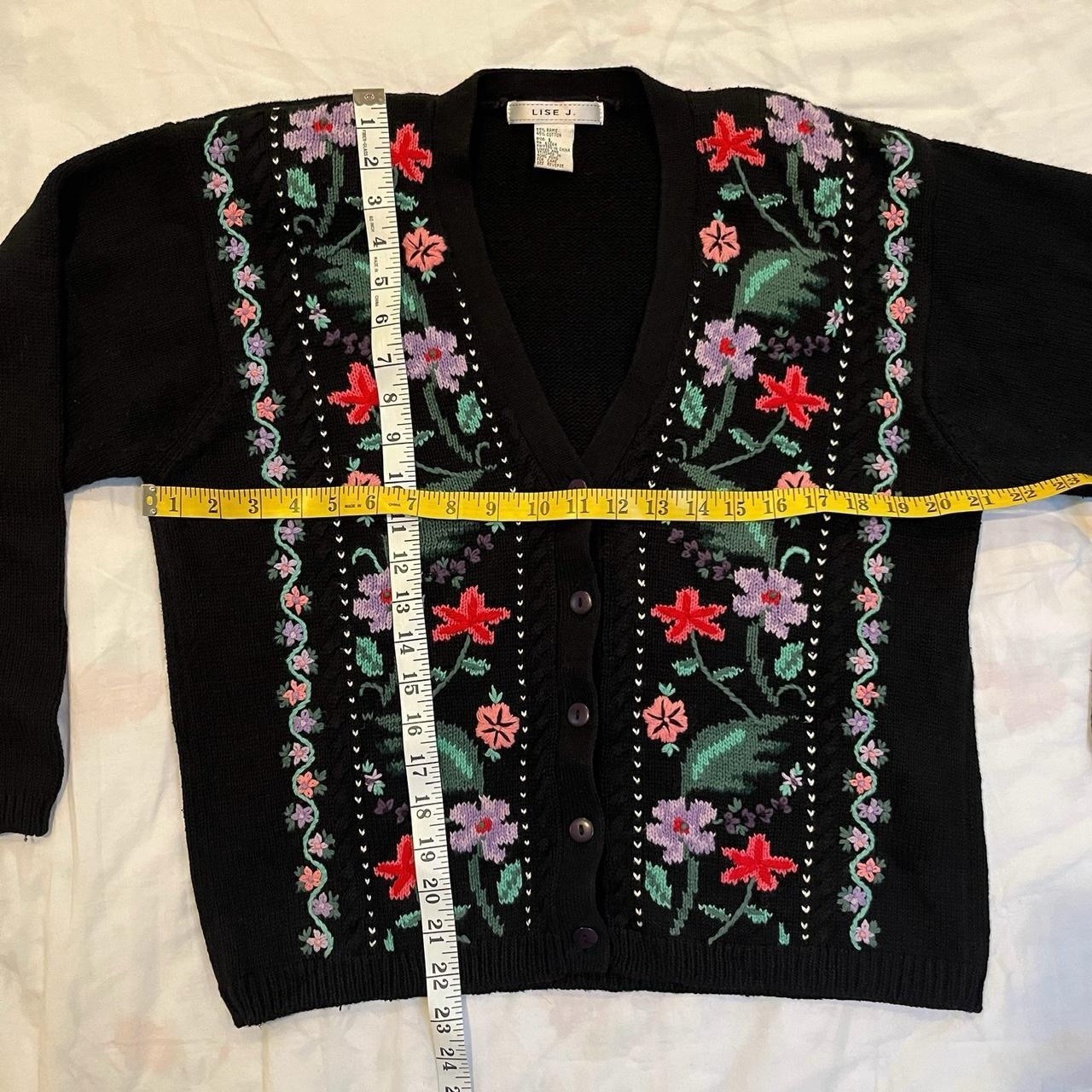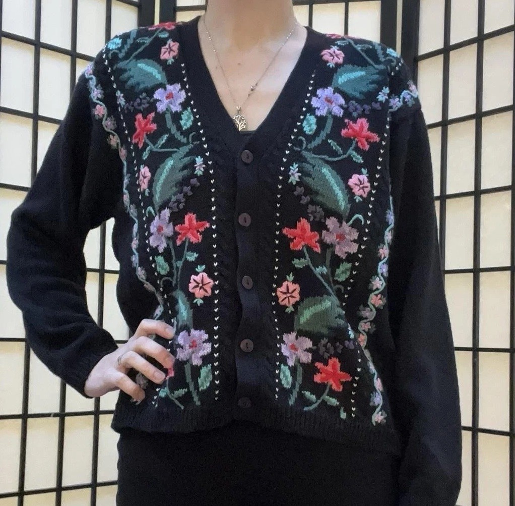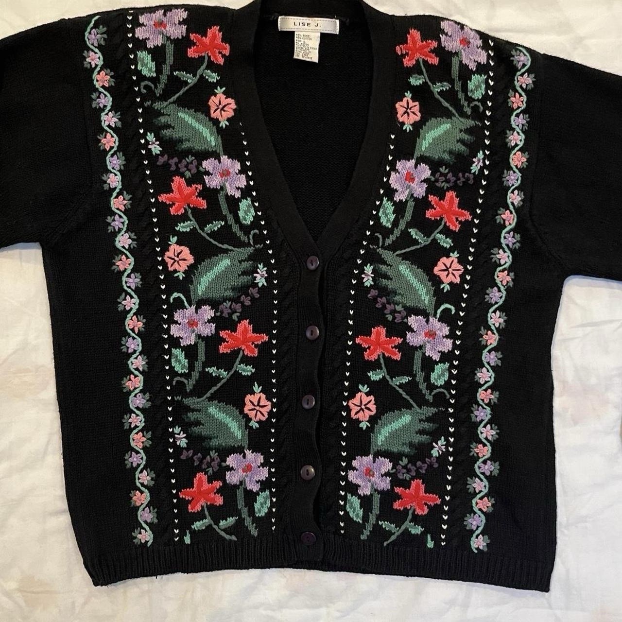 как выглядит Black Floral Embroidered Cardigan Vintage 90s Lise J. Size L Cottage Whimsygoth фото