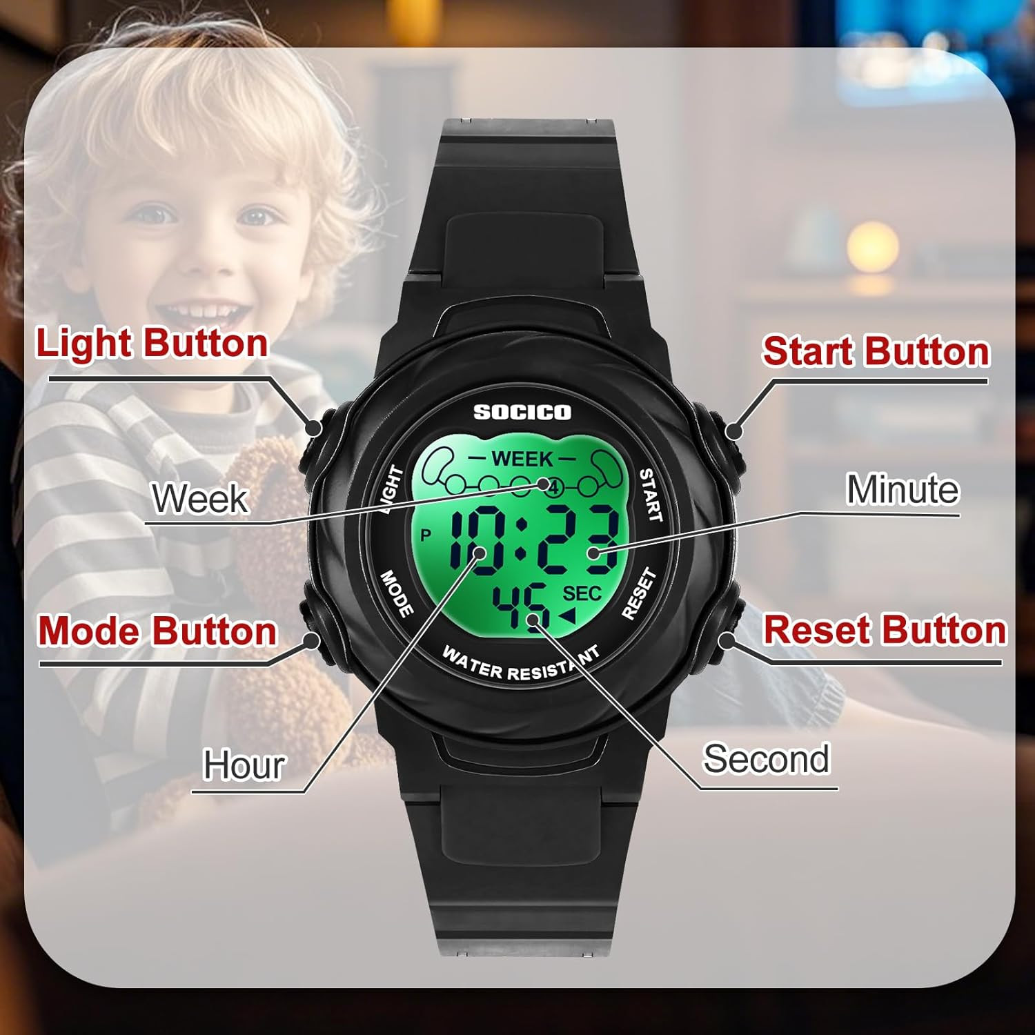 SOCICO Kids Digital Watches for Girls Boys, 7 Color Lights Waterproof Sport Outd