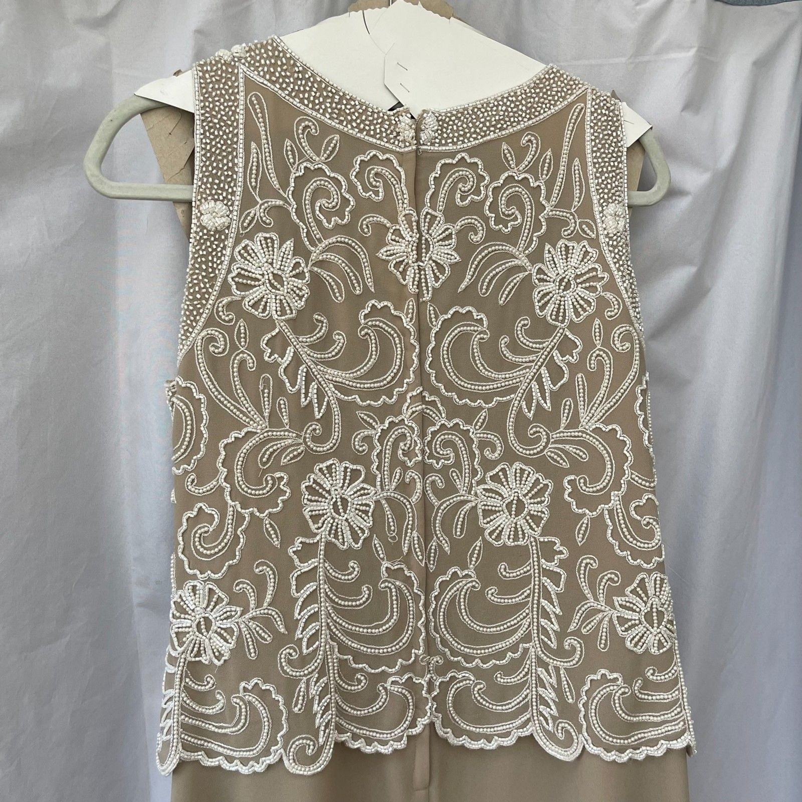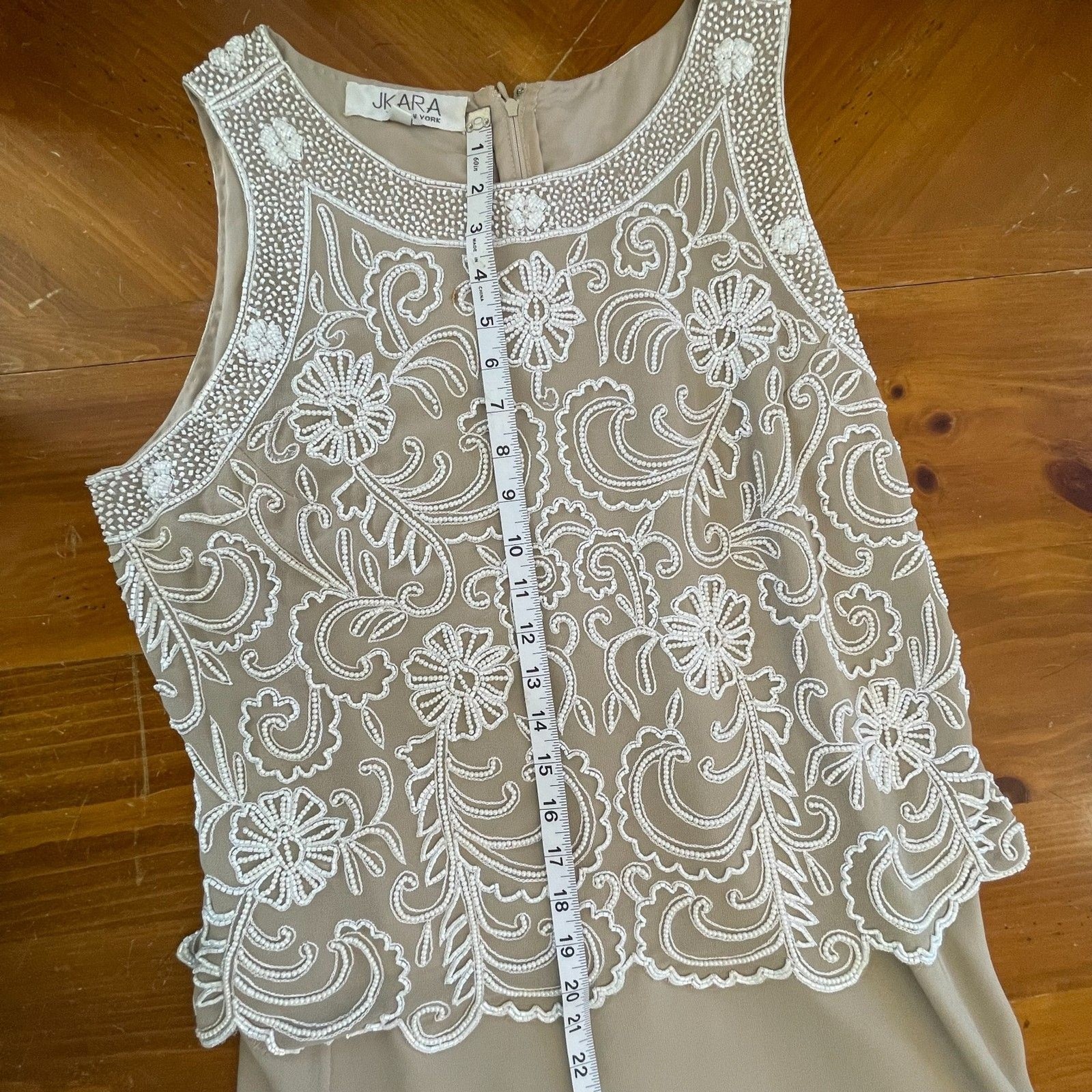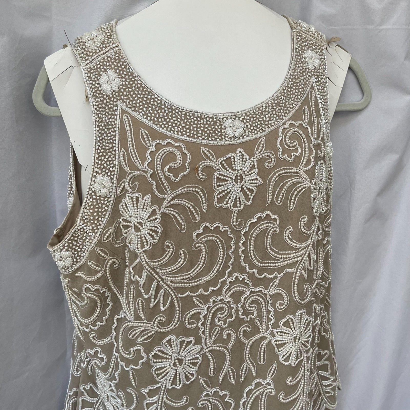 J Kara Evening Gown Beaded Bodice Scallop Sleeveless Chiffon Dress Taupe 16
