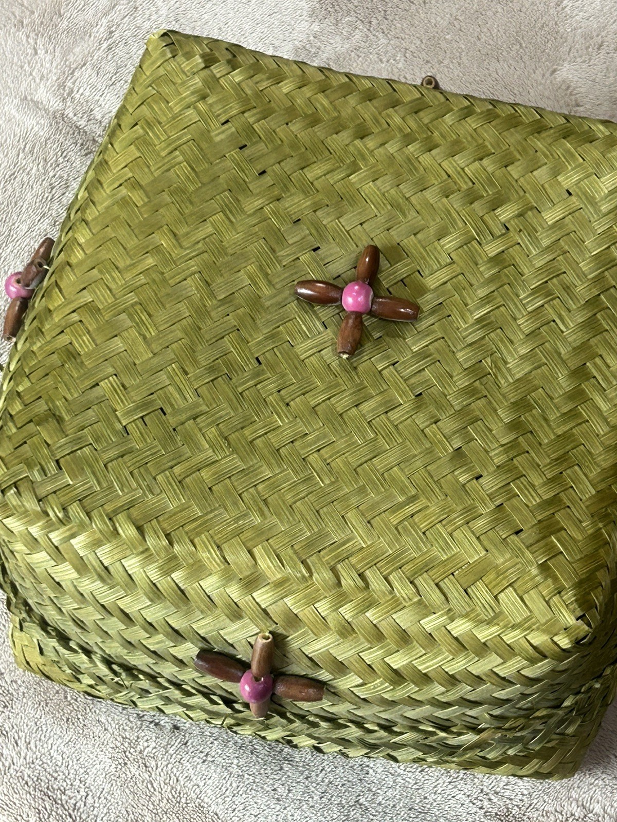 как выглядит Green Hand Woven Basket Beads Lid Organize Home Decor Square Box фото