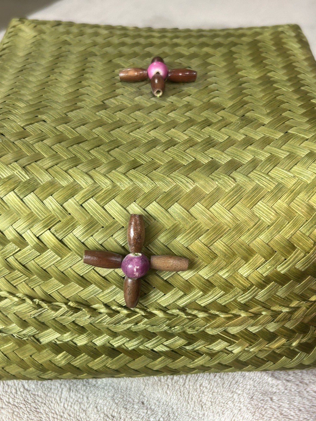 Green Hand Woven Basket Beads Lid Organize Home Decor Square Box