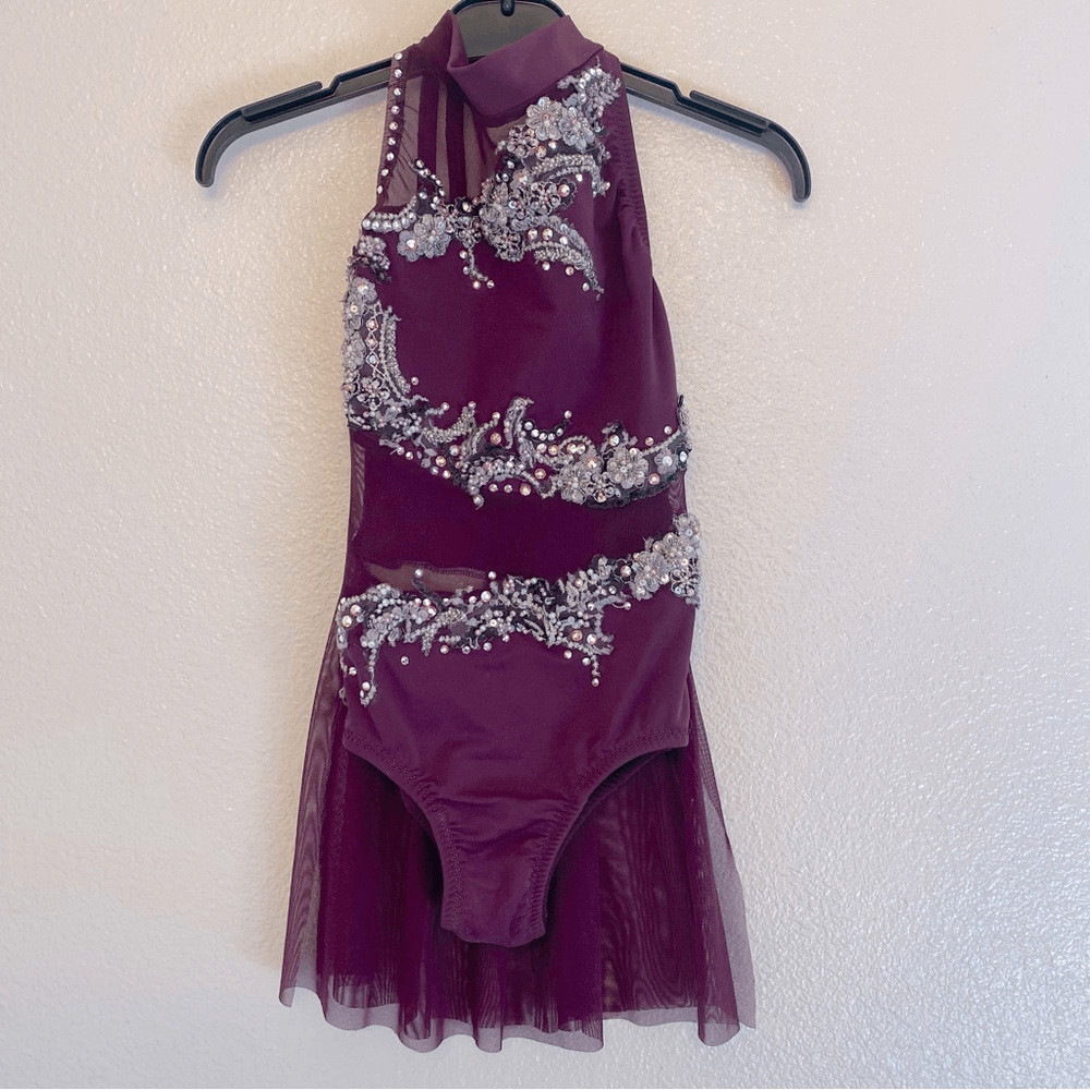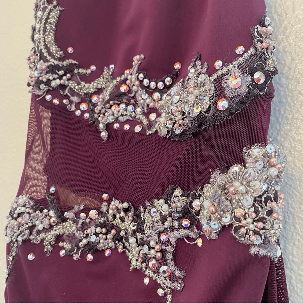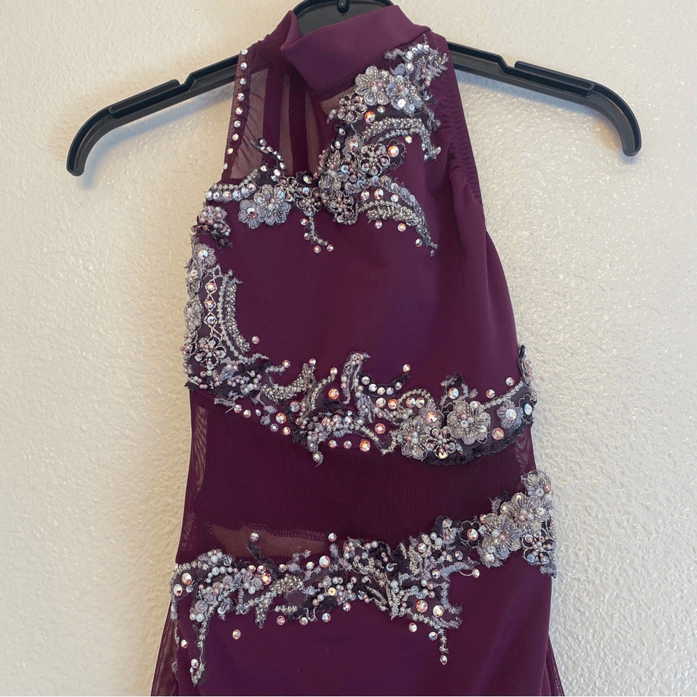как выглядит Custom Solo lyrical embellished rhinestone Dance Costume purple leotard dress MC фото