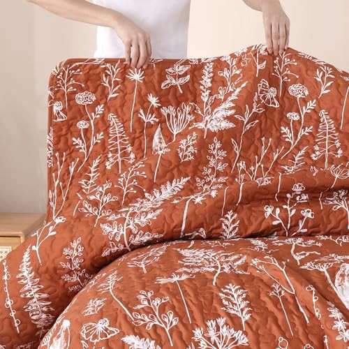 Bed Spread Boho Quilt with Floral Pattern Microfiber Quilts King Terracotta
