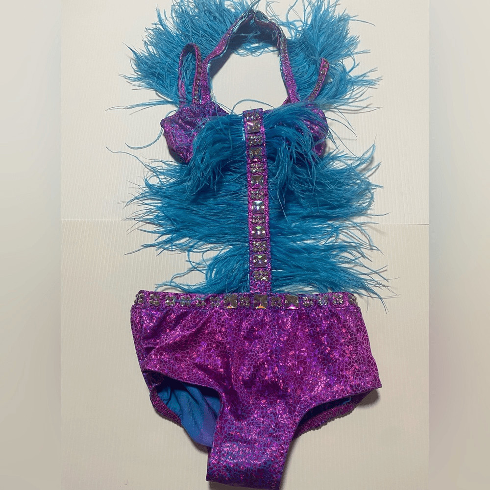 Custom Glamorous solo dance costume purple blue sassy embellished feathers LC