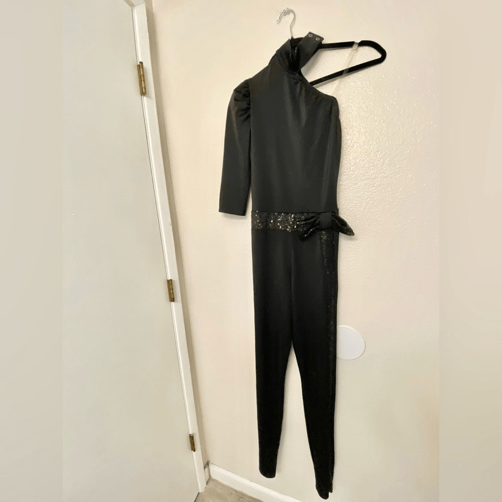 Kelle dance solo costume black asymmetrical jumpsuit unitard bowtie MA adult