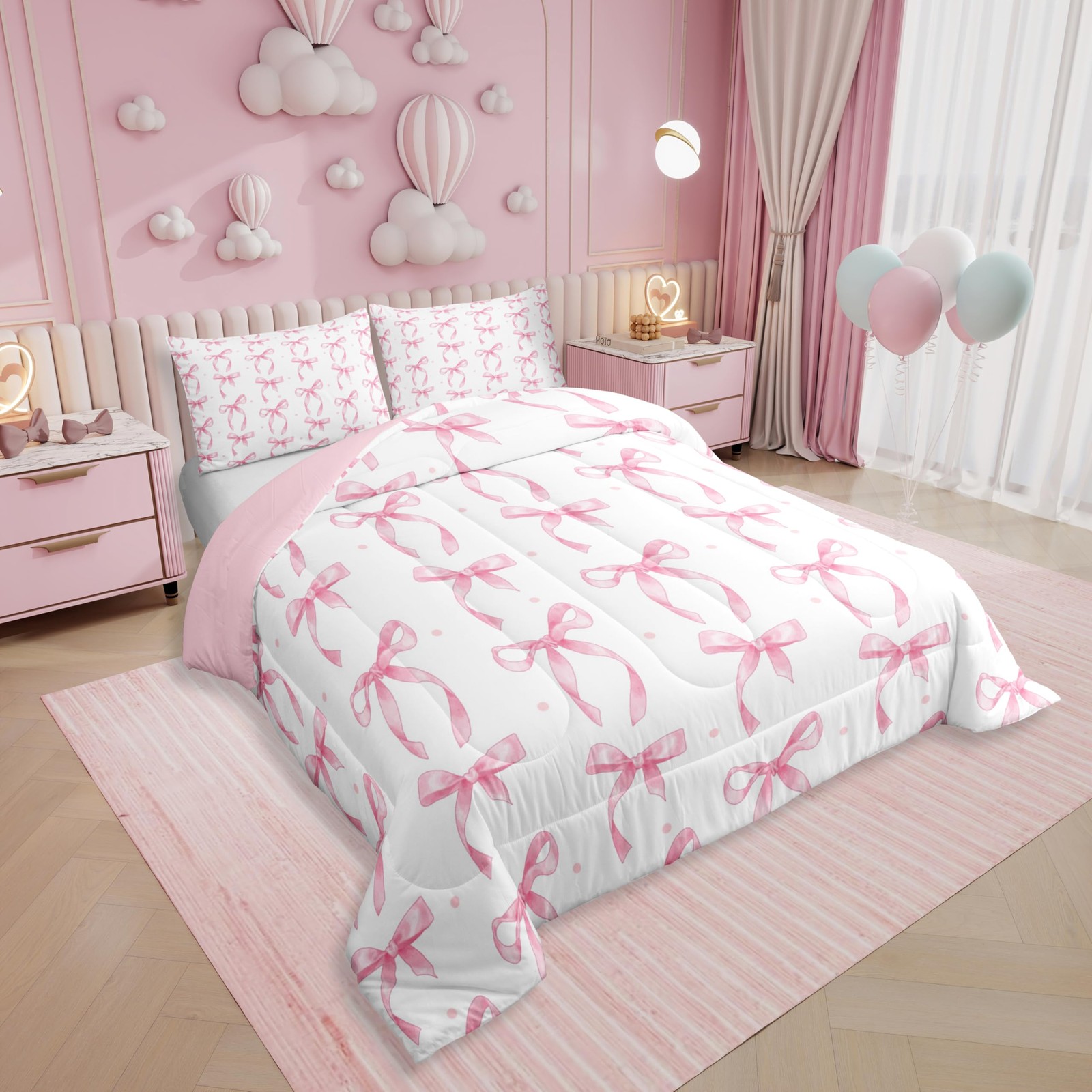 Cute Pink Bow Twin Bedding Set for Girls,Ribbon Bow Knot Comforter Set for Ka...