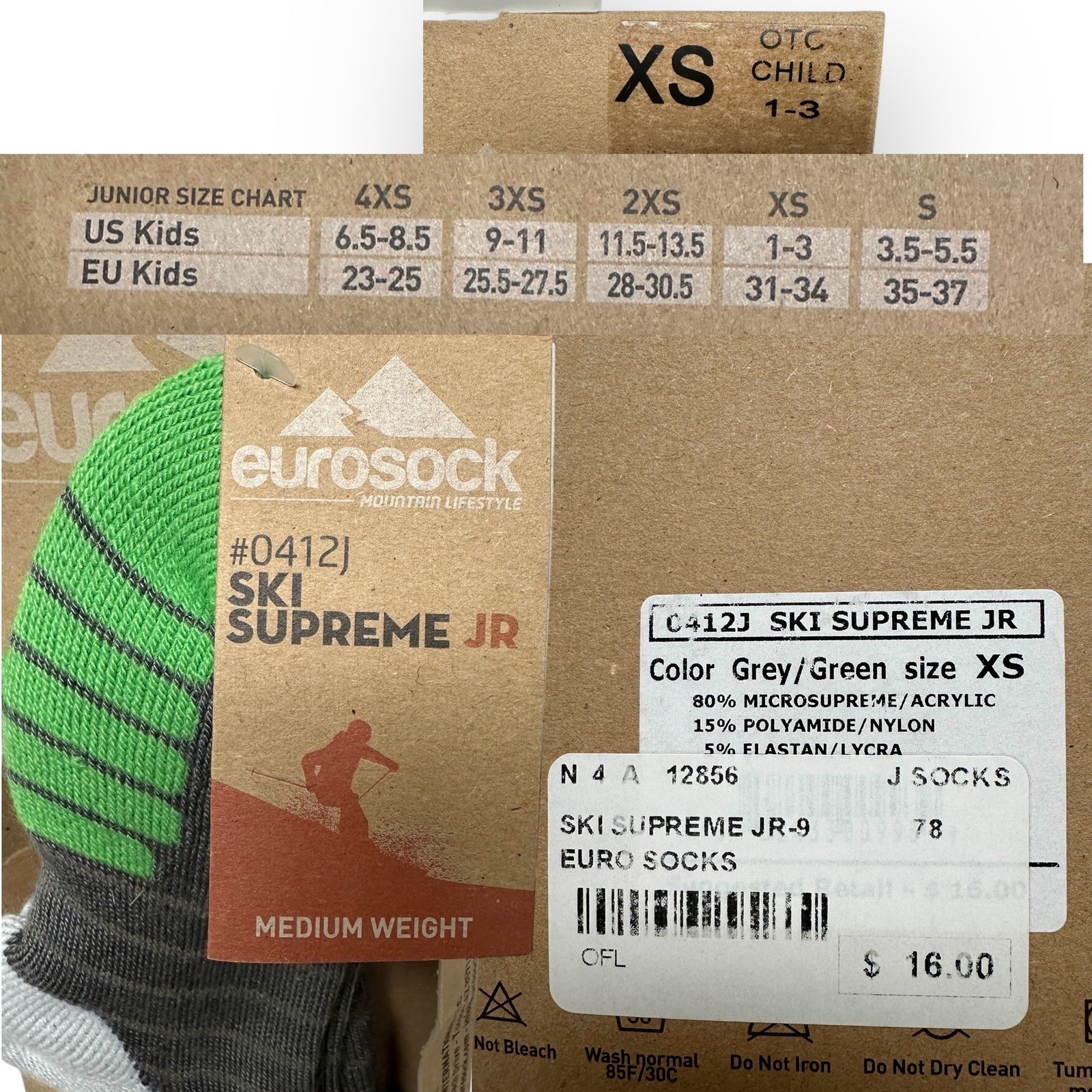 Eurosock Ski Supreme Junior Midweight Socks Kid s Size XS US 1-3 , Grey Green