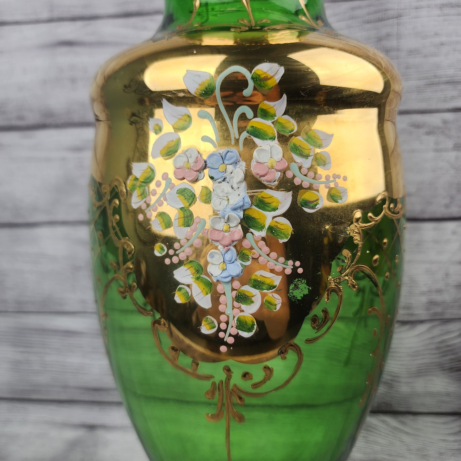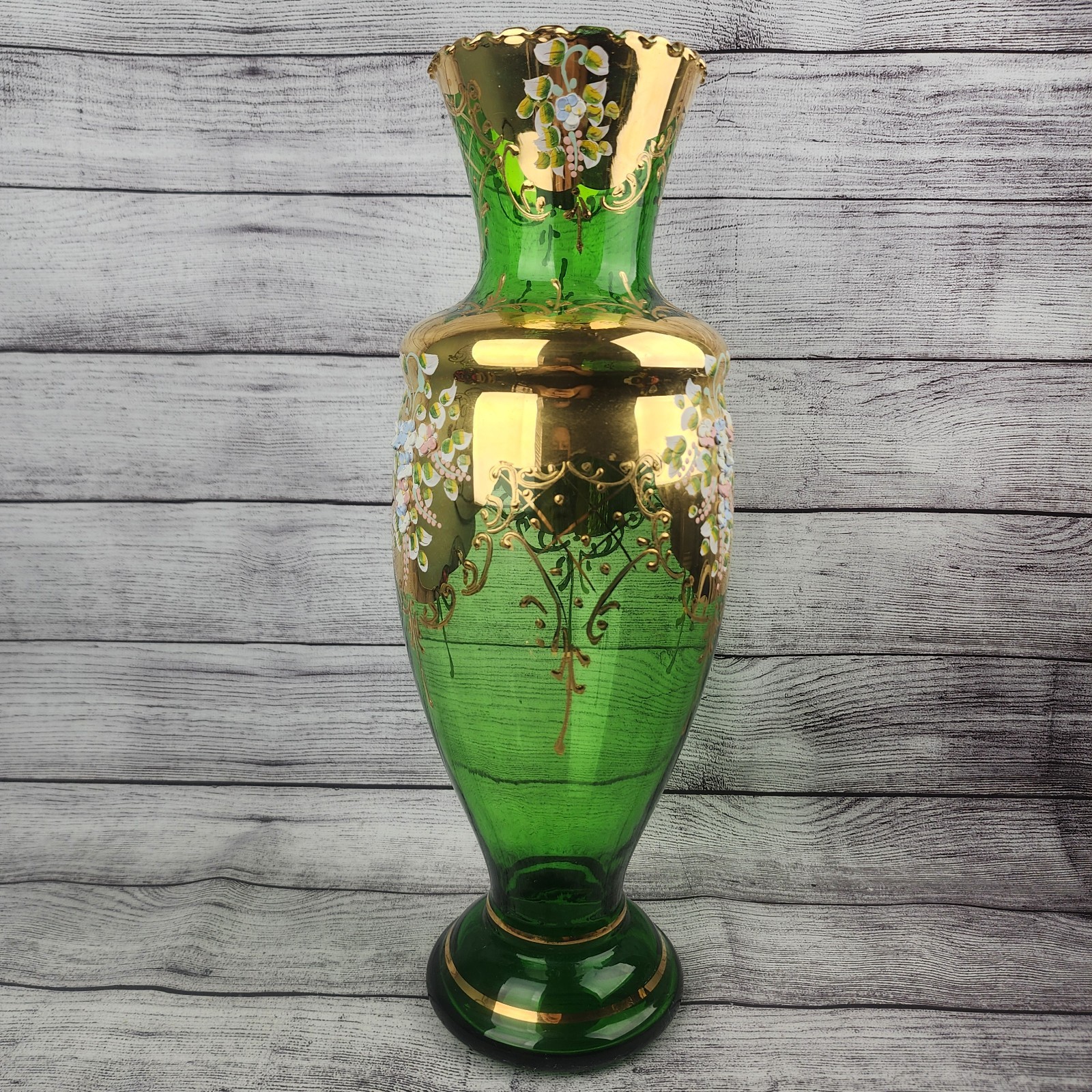 как выглядит HUGE 16" Vase Italian Murano Bohemian Green Glass 24kt Gold Flowers фото