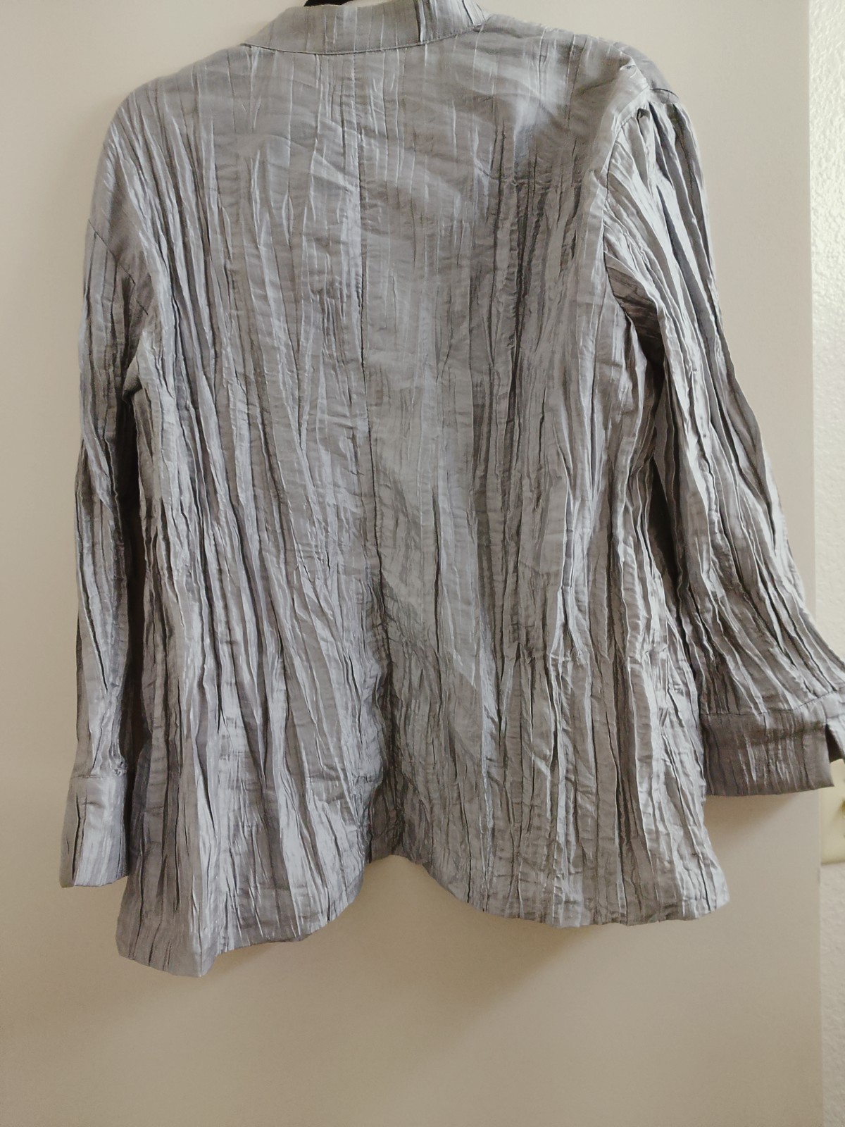 как выглядит Chicos 3 smoky gray crepey jacket. Open front. Poly blend Dry clean. 3/4 sleeve фото