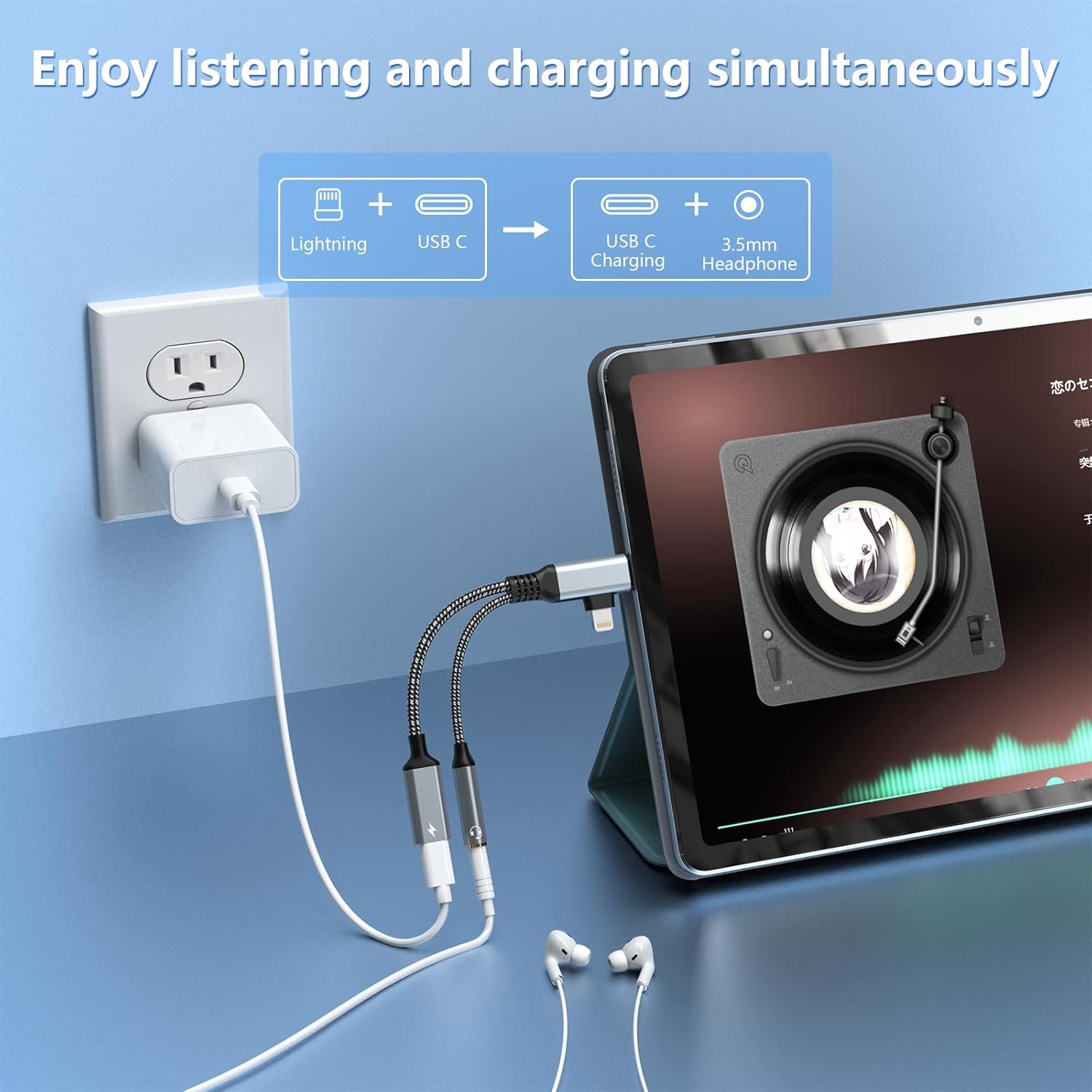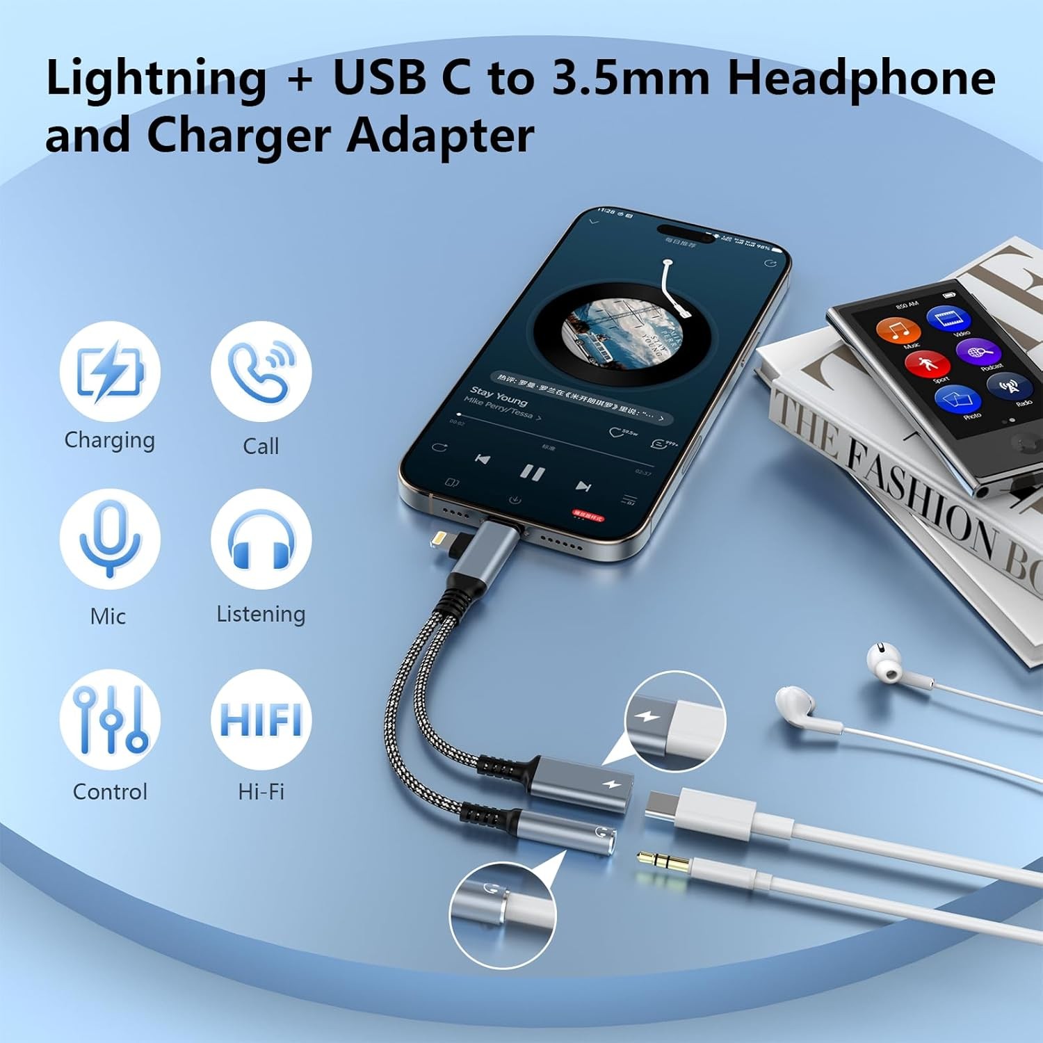Lightning and USB C to 3.5mm Headphone Fast Charger Adapter 2-in-2...