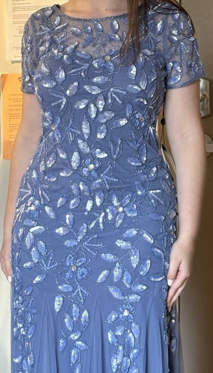 как выглядит NWT Adrianna Papell Hand Beaded Short Sleeve Floral Godet Gown French Blue Sz 2 фото