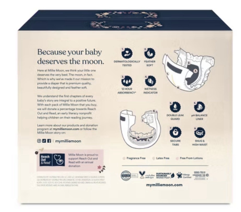 New All Natural Millie Moon Disposable Diapers Cloud Touch Softness Size 1
