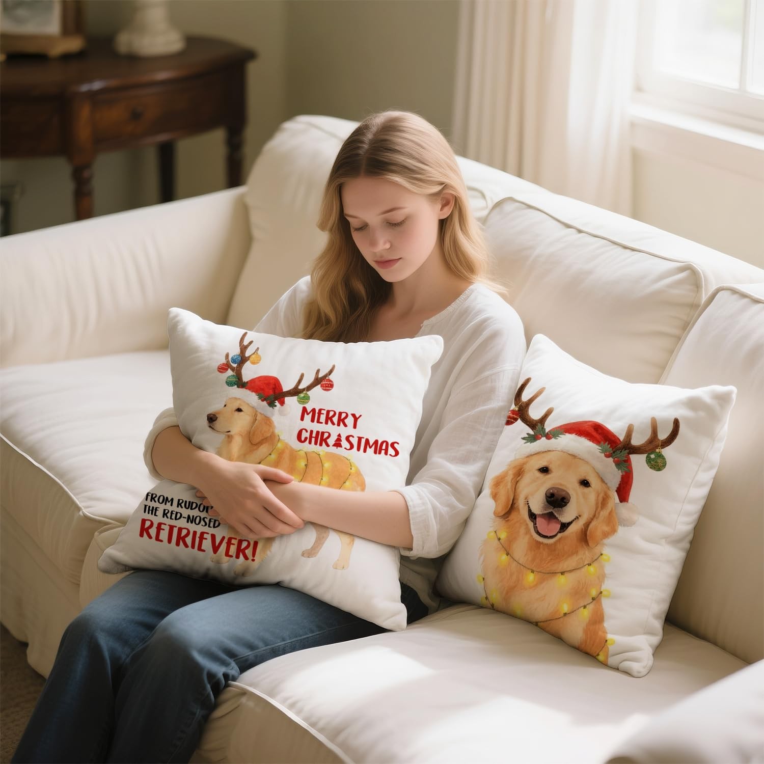 Golden Retriever Dogs Christmas Throw Pillow Covers,Reindeer Decorative Cushi...