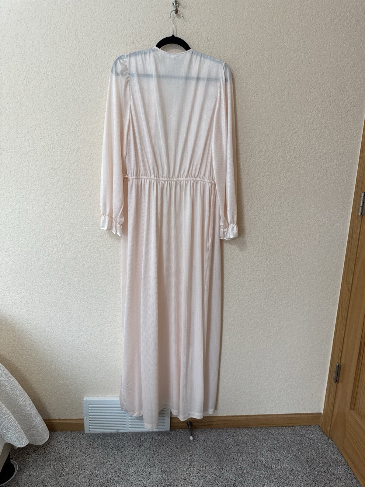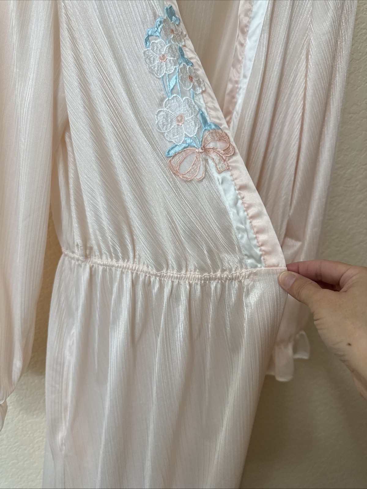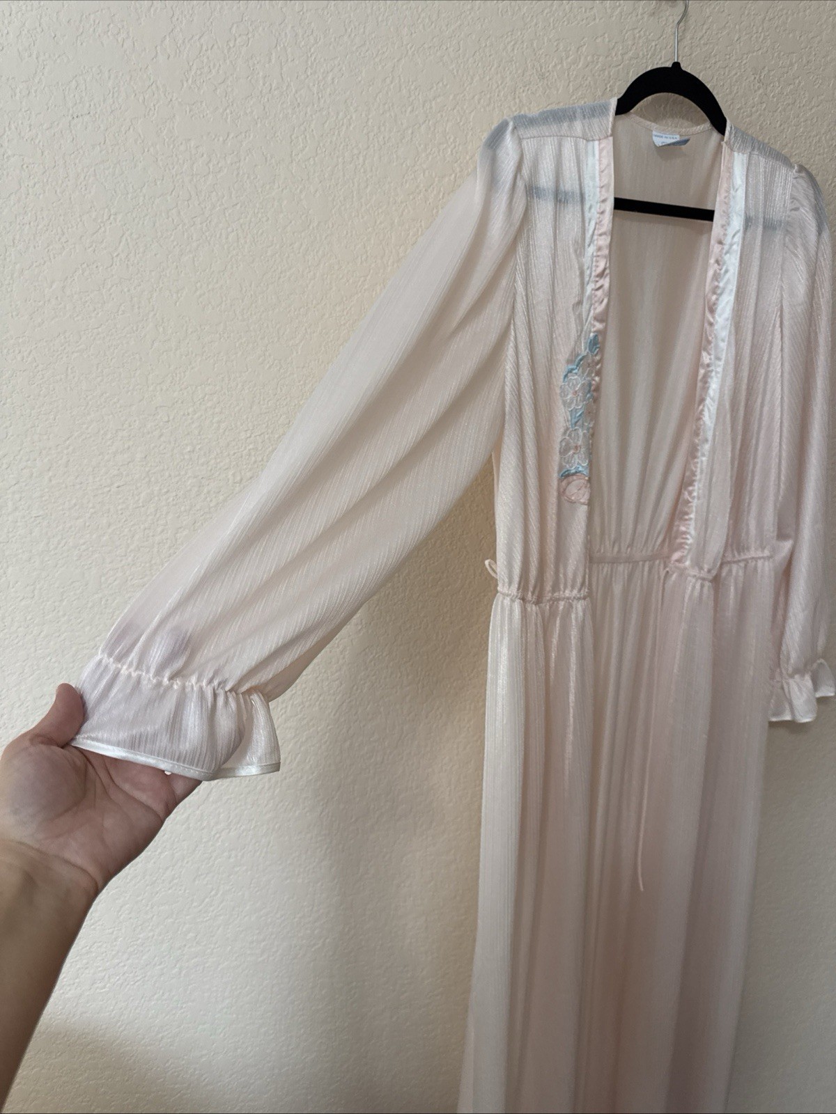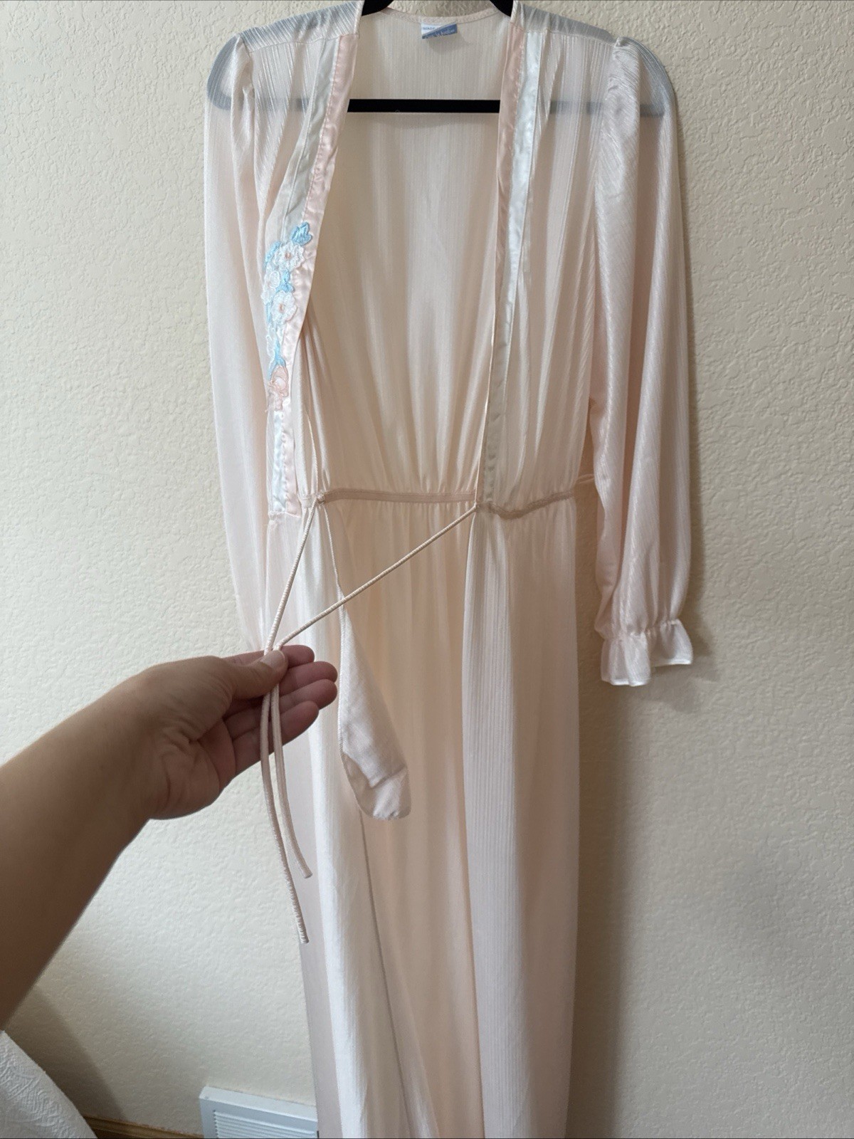 как выглядит VTG VAL MODE Maxi Nylon Robe Peignoir Pale Pink Satin Trim Appliqu Sz L USA фото