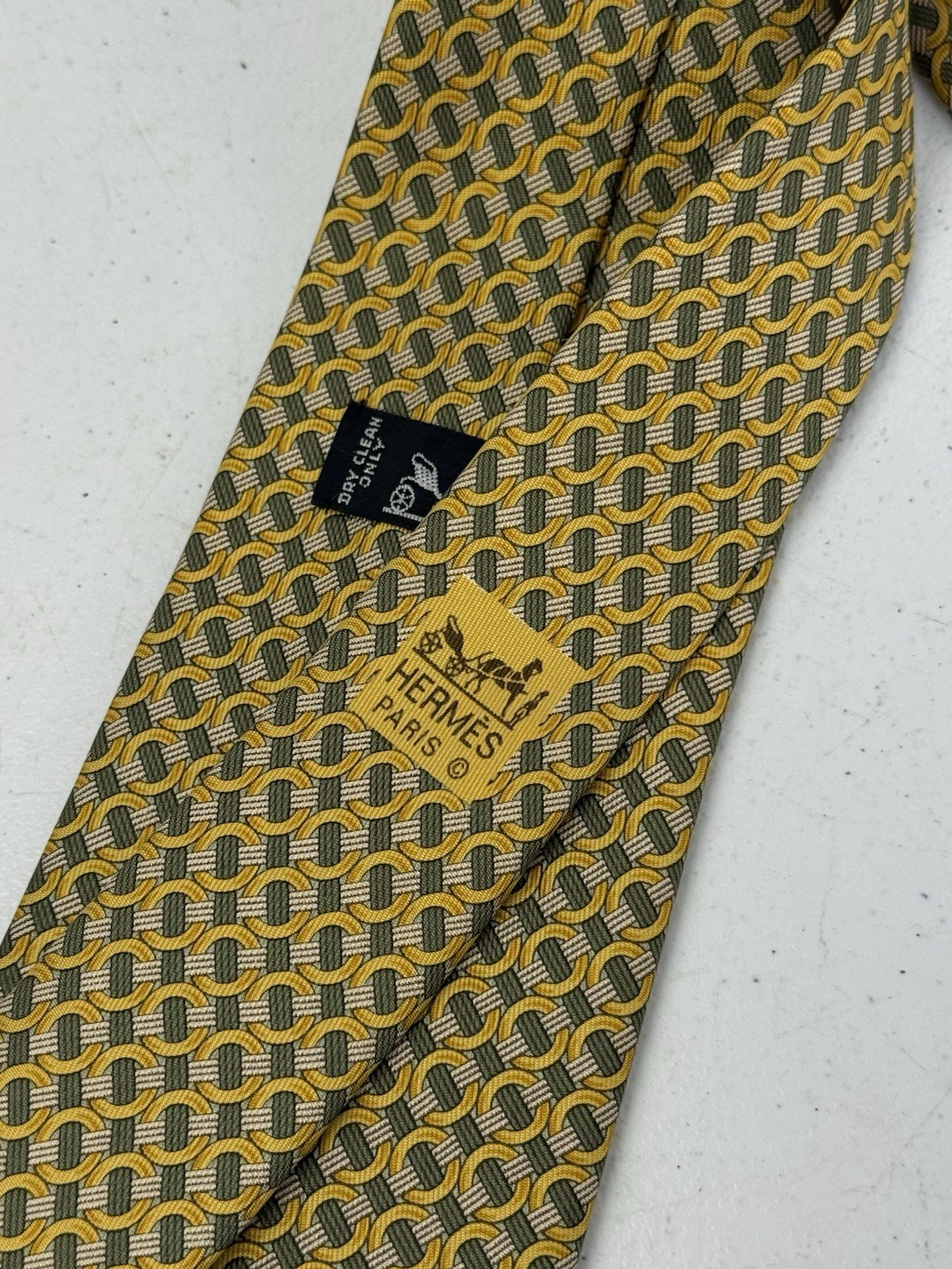 HERMES Necktie Tie Green Yellow all-over pattern 100 Silk made in France 7760