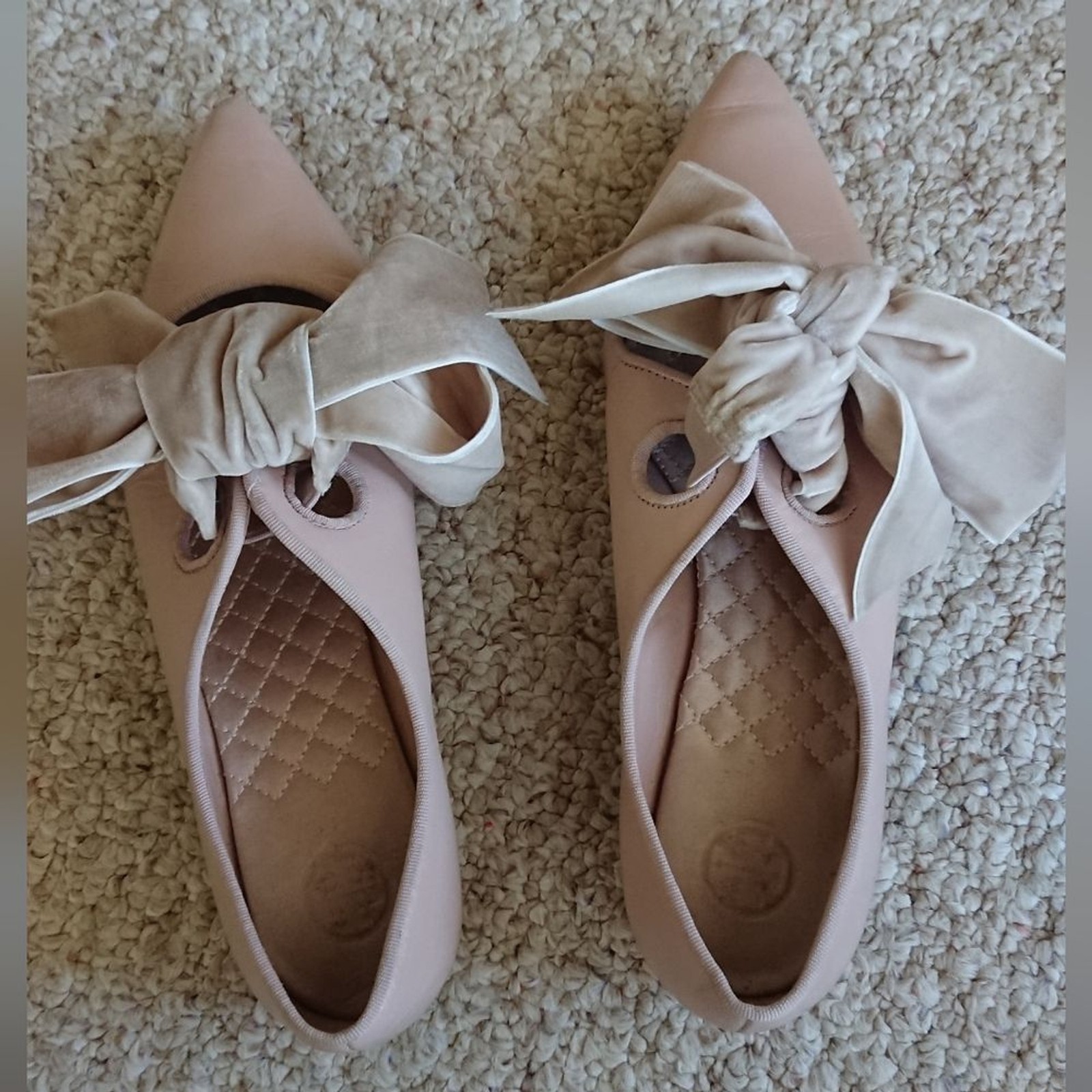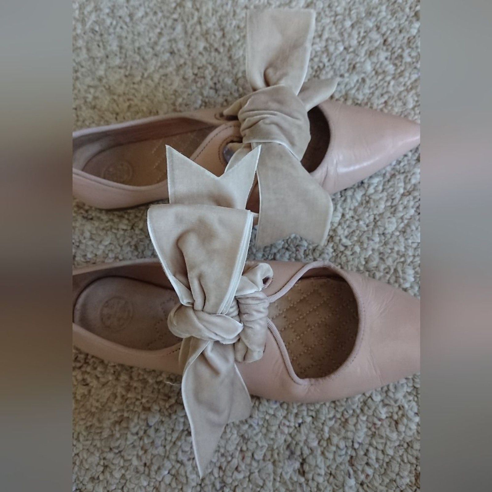 как выглядит Tory Burch Clara Mules Bow Heel in nude/blush size 7 фото