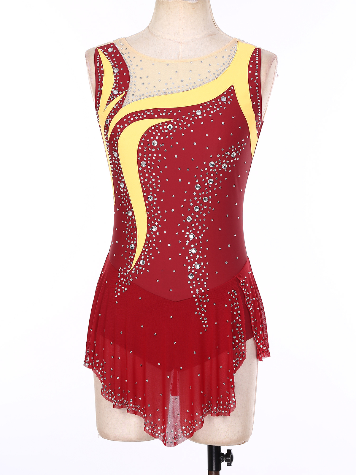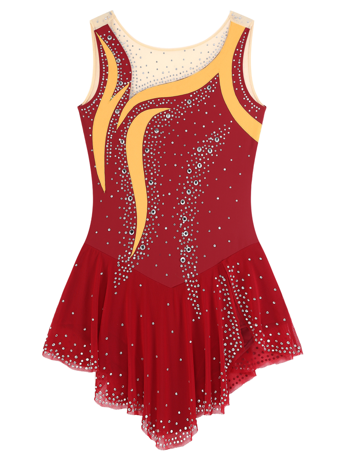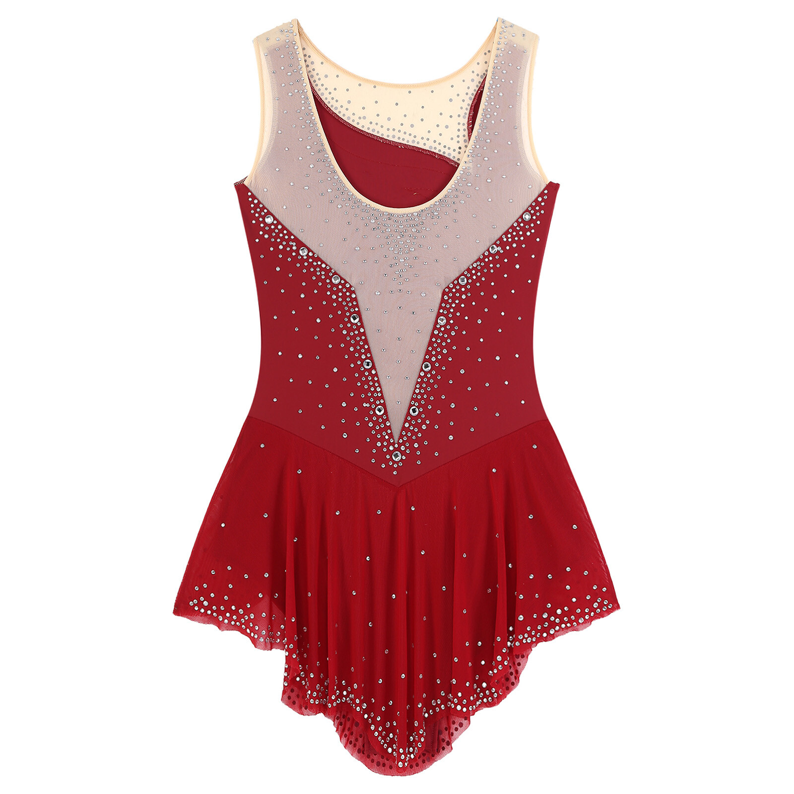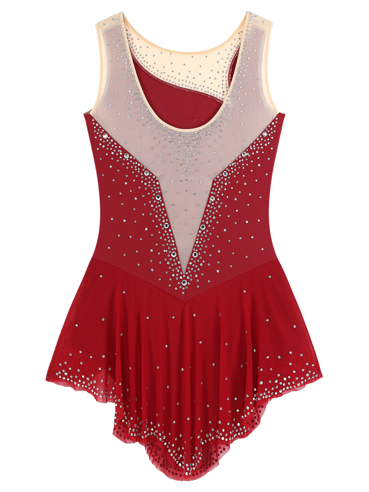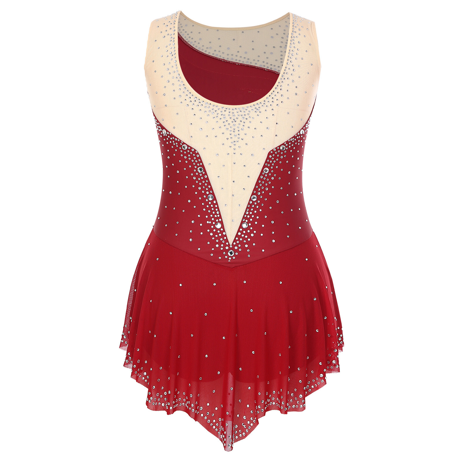 Women Sleeveless Figure Skating Costume Rhythmic Leotard Sparkly Chiffon Skirt