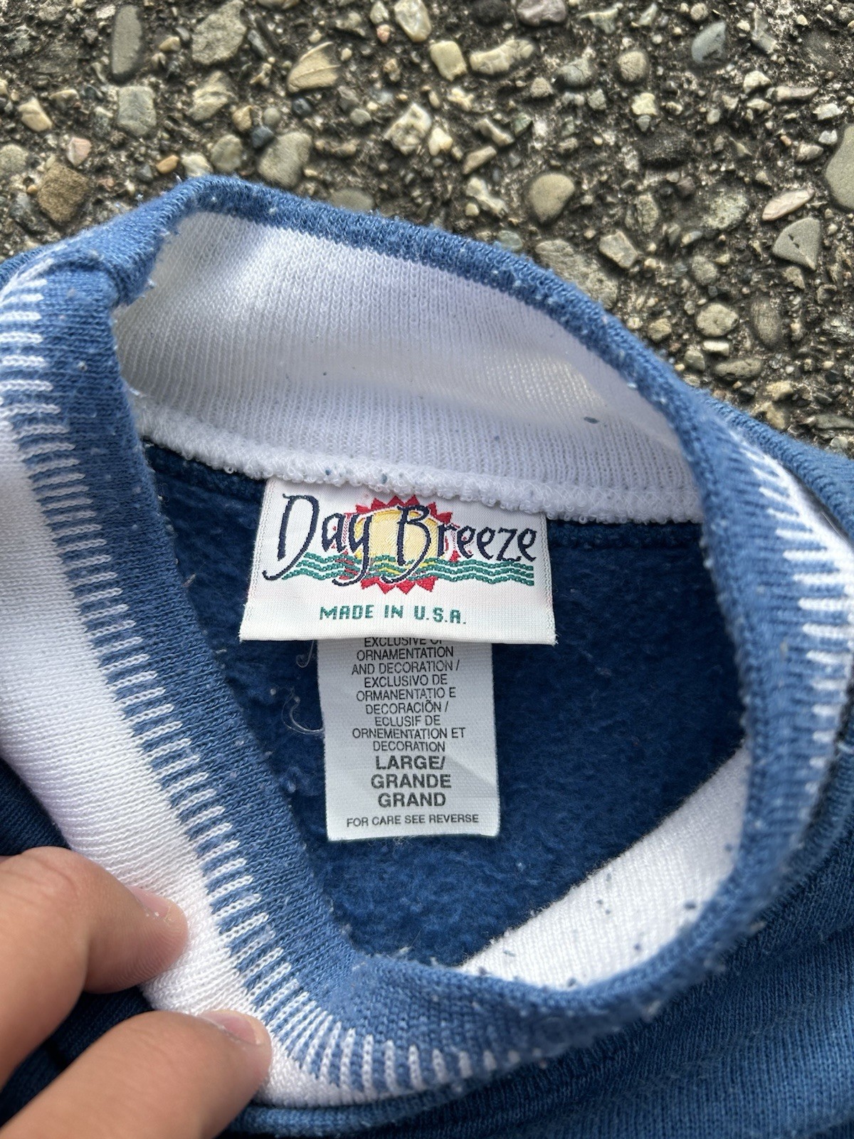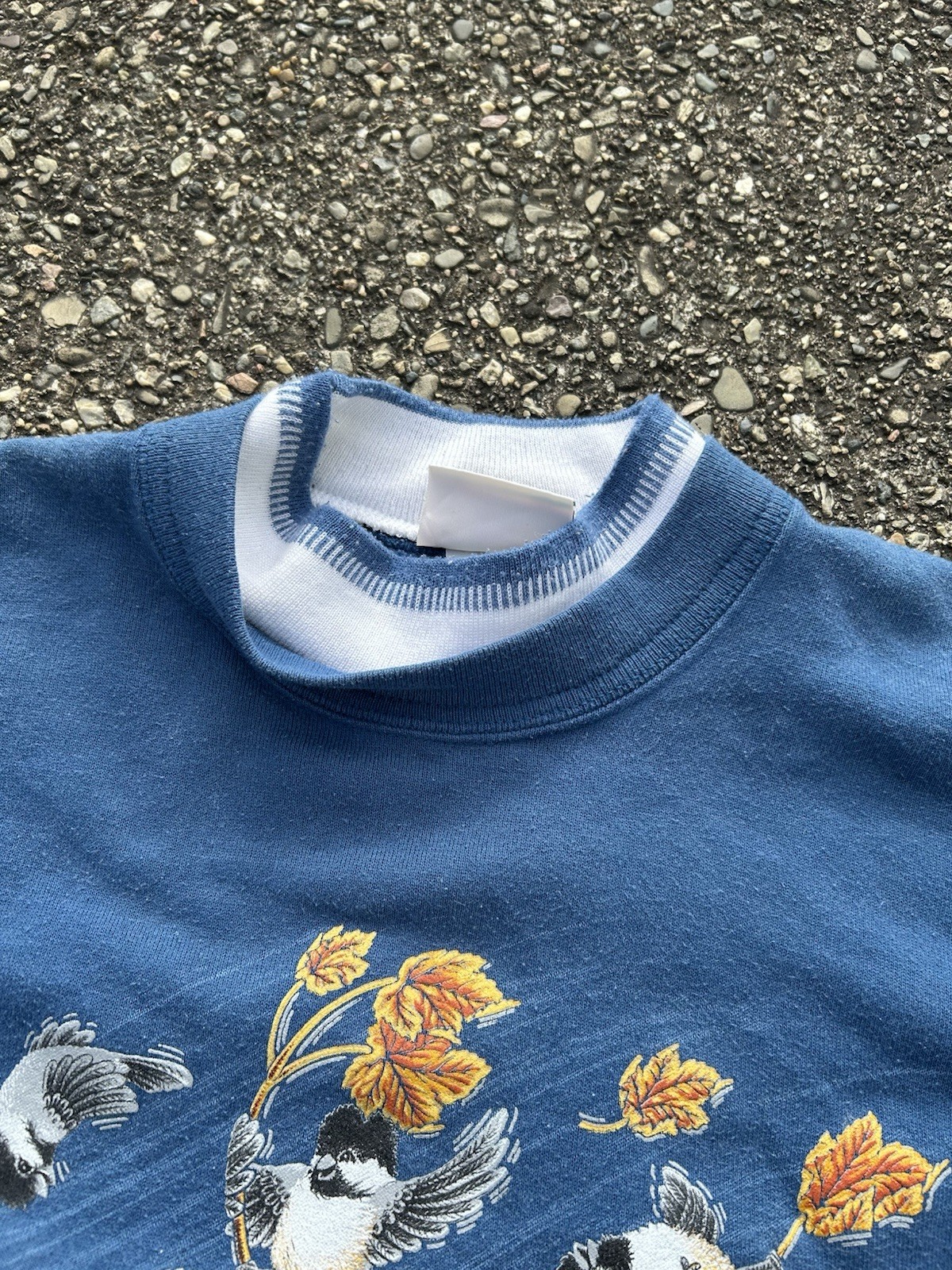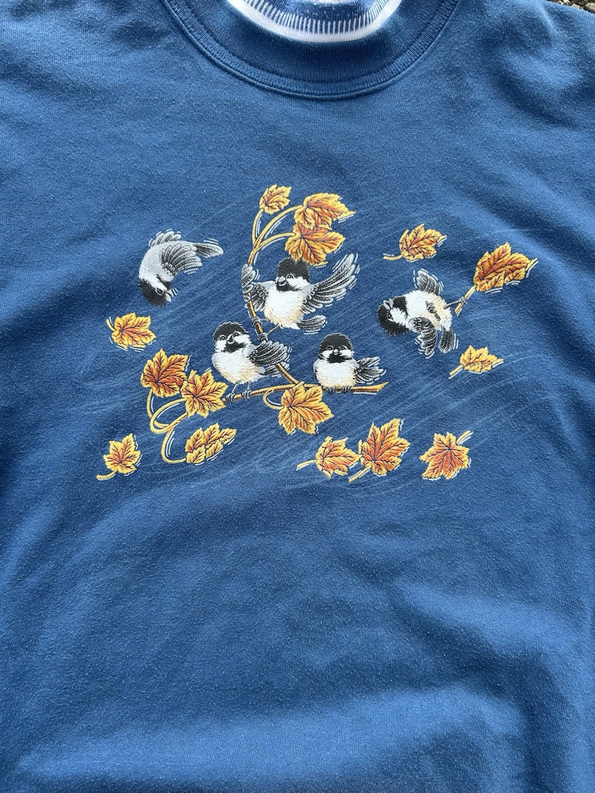 90s Blue and white vintage sweatshirt with birds and leaves design finds