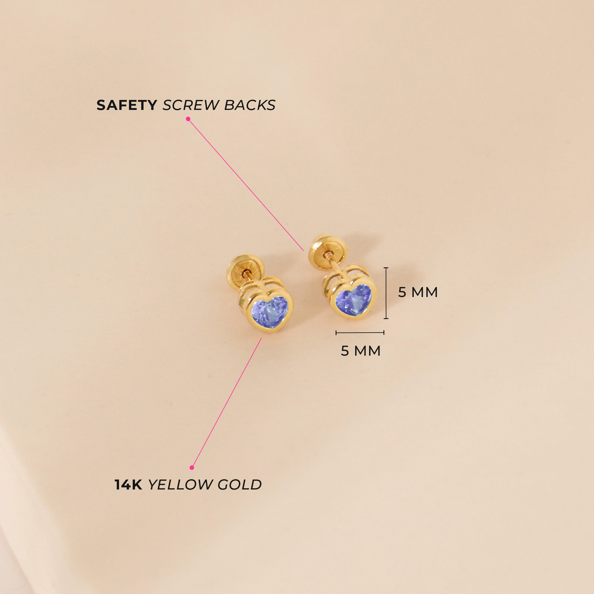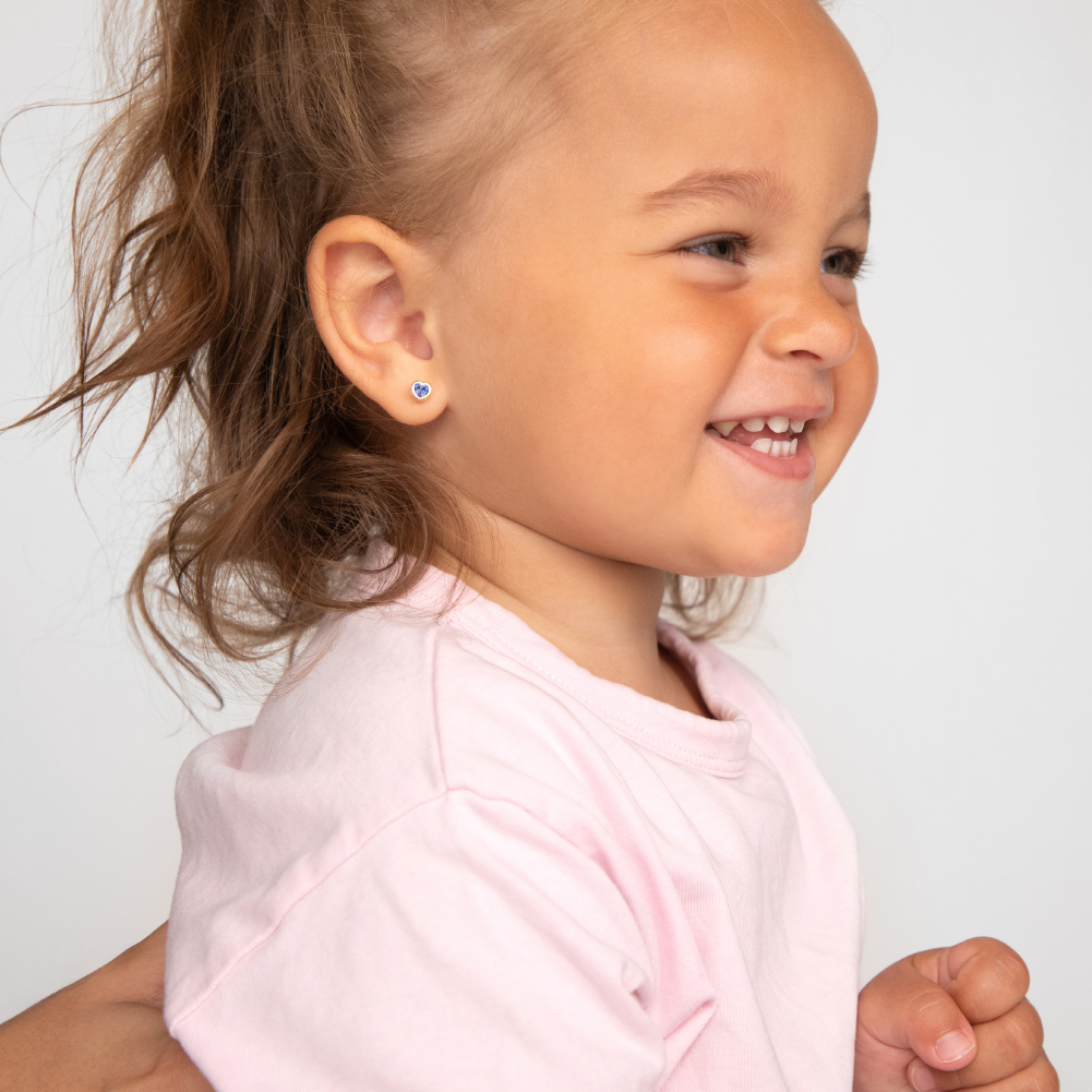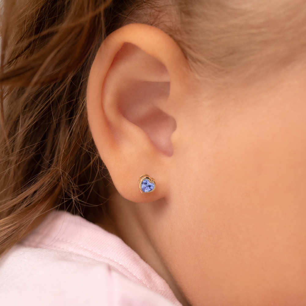 14k Gold Heart Bezel Simulated Birthstone Kid / Girls Earrings Safety Screw Back