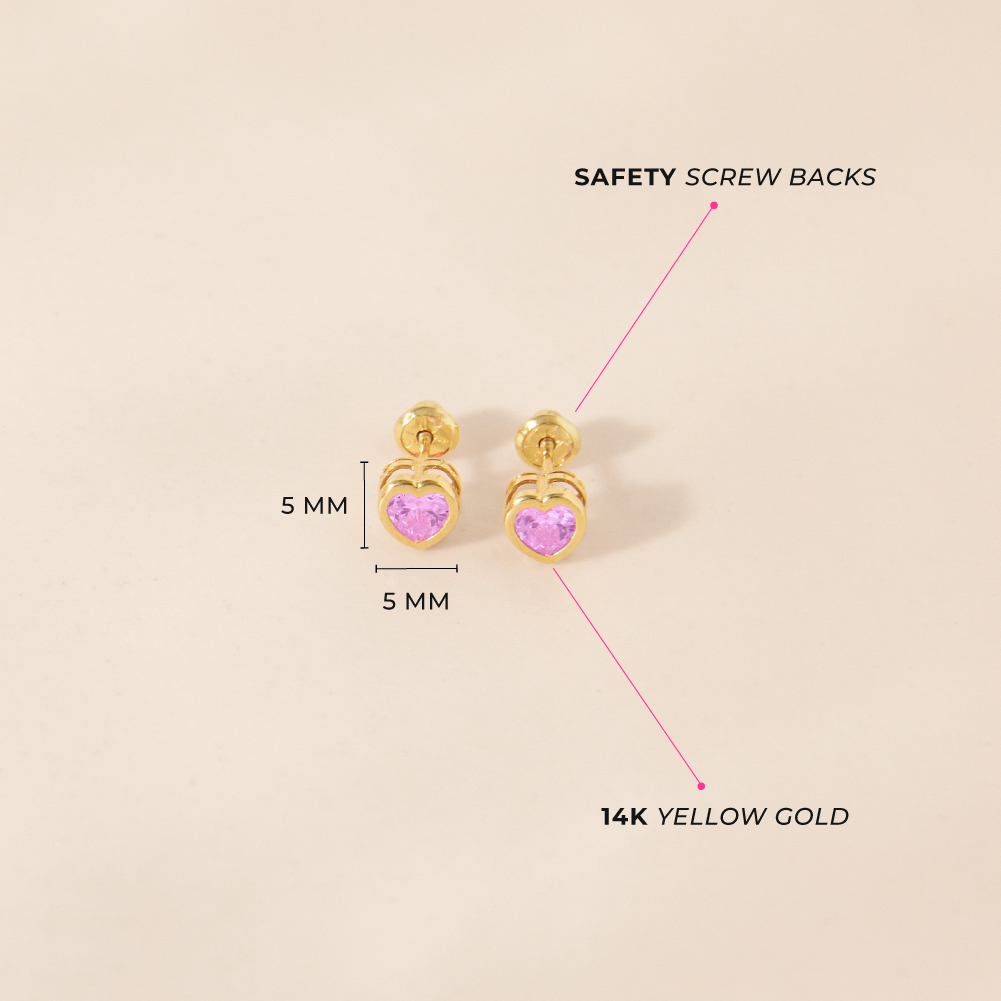 14k Gold Heart Bezel Simulated Birthstone Kid / Girls Earrings Safety Screw Back