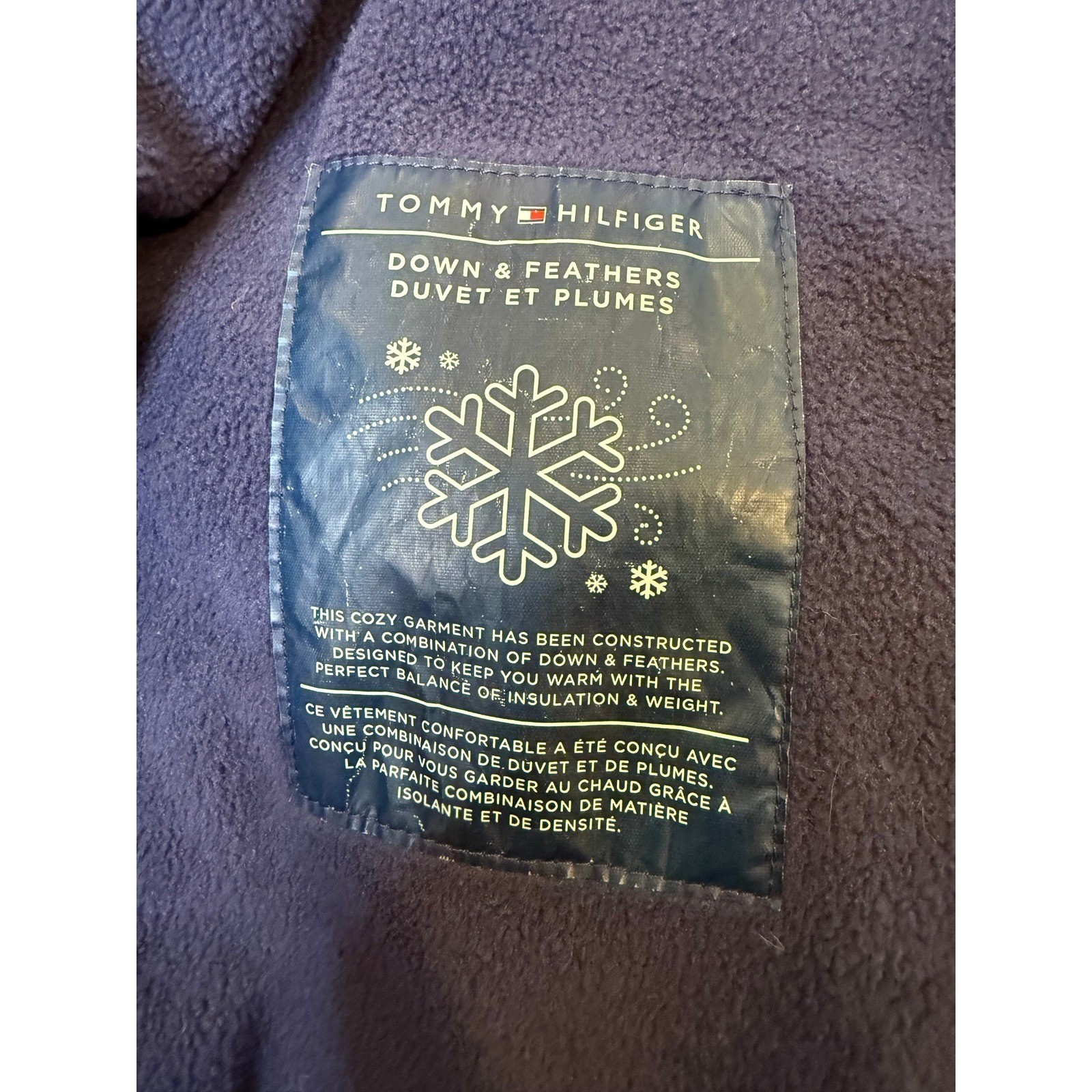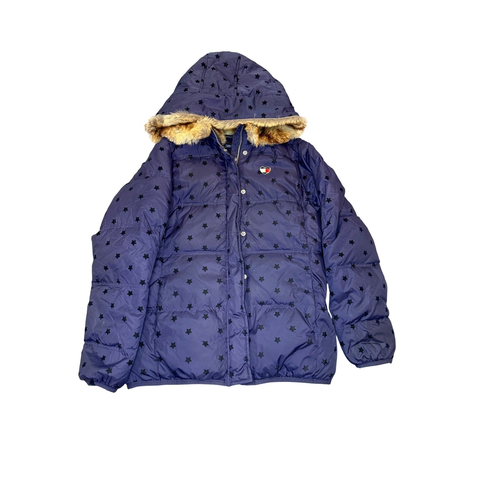 как выглядит Tommy Hilfiger Girls Puffer Jacket Navy Blue Star Print Faux Fur Hood Size 12-14 фото