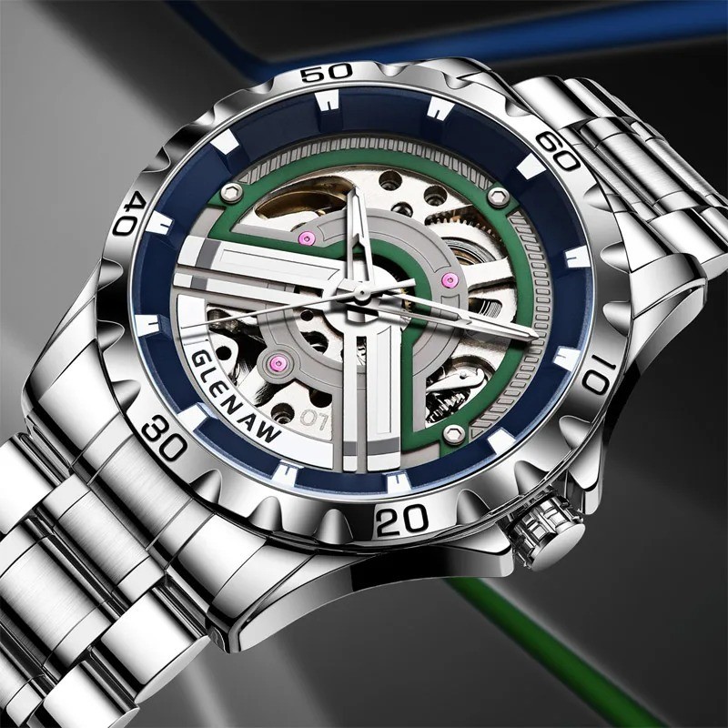 43MM GLENAW Automatic Men Watch Luxury Skeleton Waterproof Stainless Steel NEW